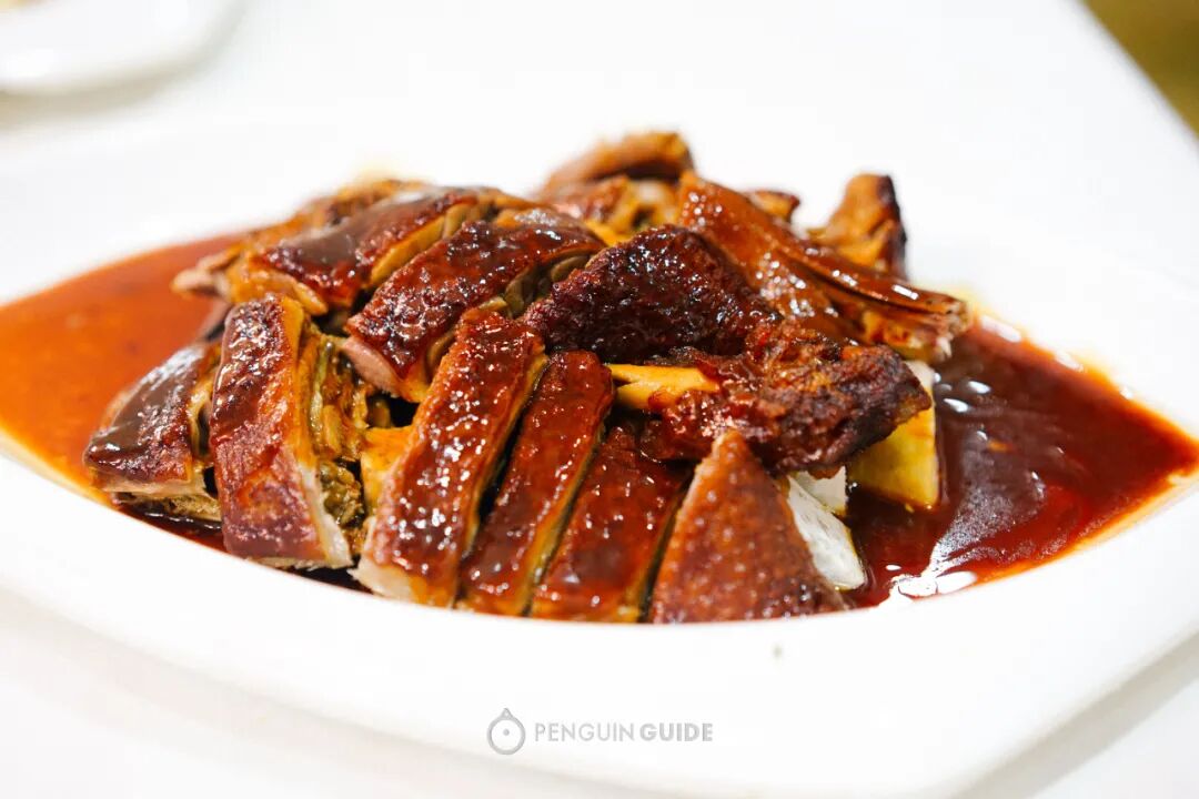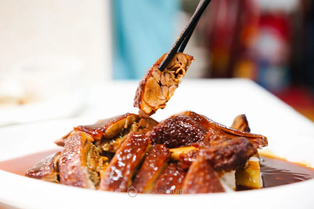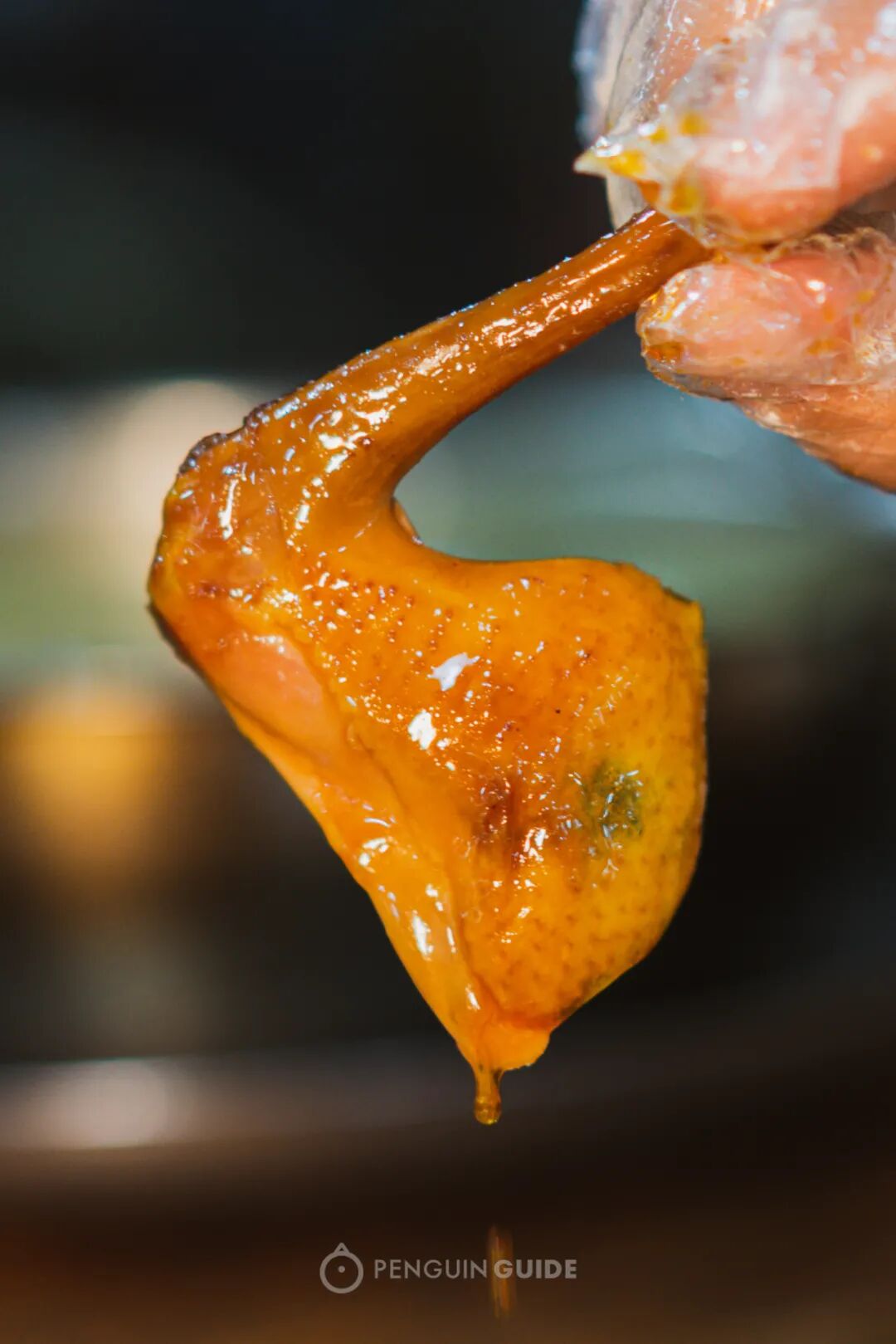 比如这只碌鹅,做法很麻烦,需要手动不停转动鹅身,经过油和酱汁的洗礼,再历经焖、浇等步骤充分入味,前前后后需手工作业近一小时。
