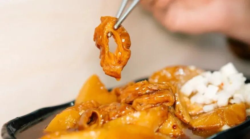 麻烦是真麻烦,但好吃也是真好吃:皮色闪耀着光泽的酱色,汁水全被收拢,内里均匀入味,还带有软嫩的嚼劲。