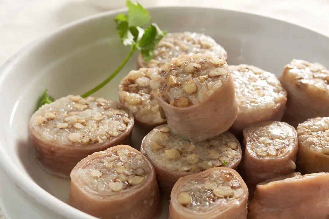 例如绿豆糯米酿大肠,在粉肠里细致地塞入绿豆糯米,手法不能太松动,也不能太拥挤,才能达到绵糯又带点韧度的口感。