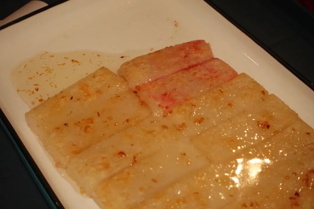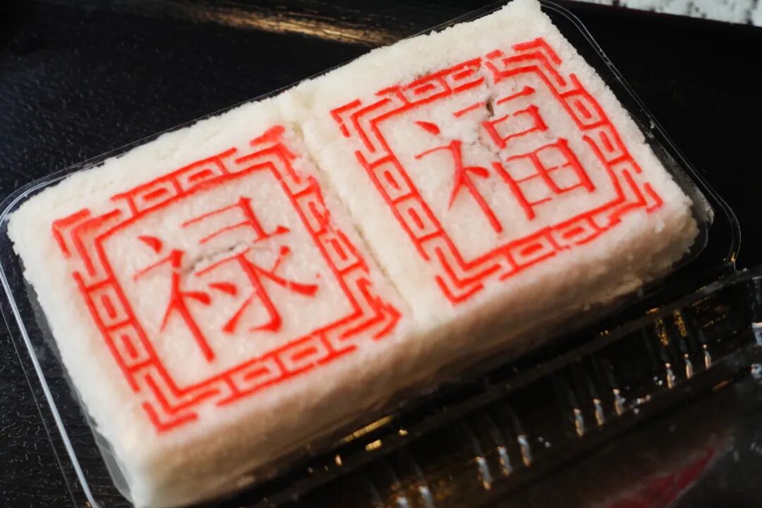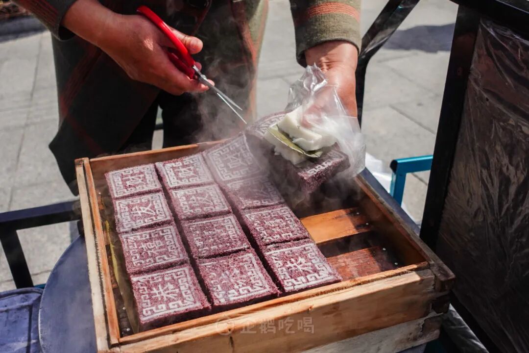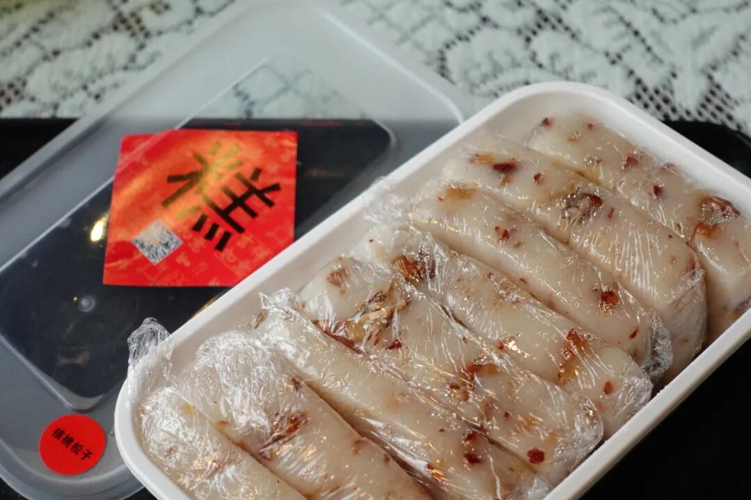 家家户户过年的时候,还要蒸一种传统大糕,长方形有标志性的两条红线,切片油煎撒红糖桂花蜜,就是一道纯真小点心。