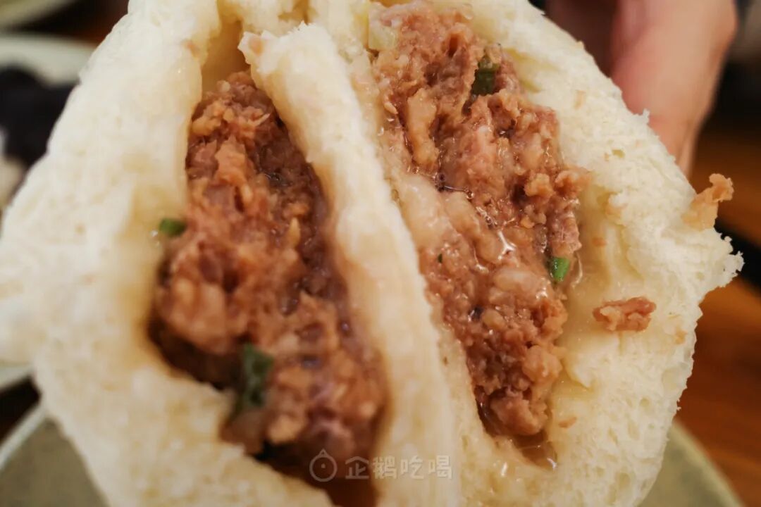 轻轻一咬,汁水充盈,肉糜之间有恰当好处的油脂,葱姜蒜调料配比也拿捏得刚好。