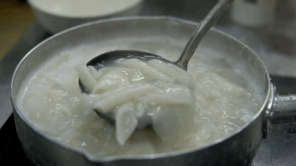 将粿角或粿条加入米浆中,煮到熟透软绵后,烧糊糜烂前出锅,质感粘稠绵滑,有温润适口的米香。