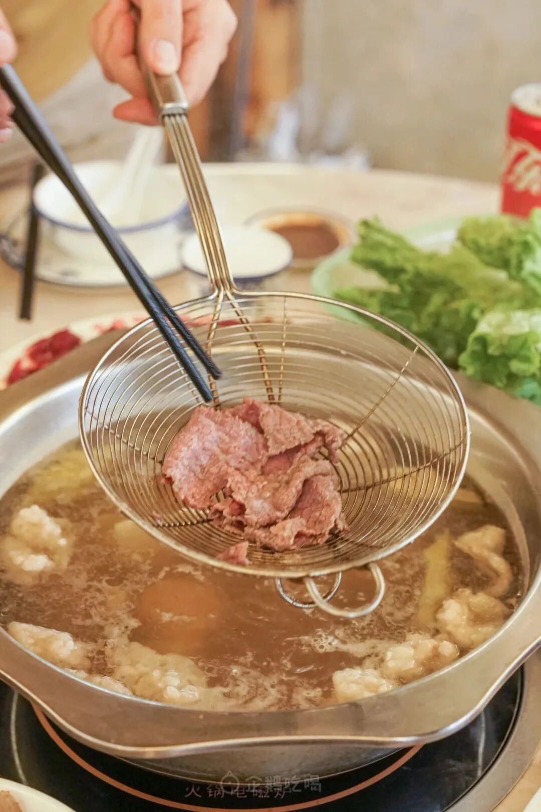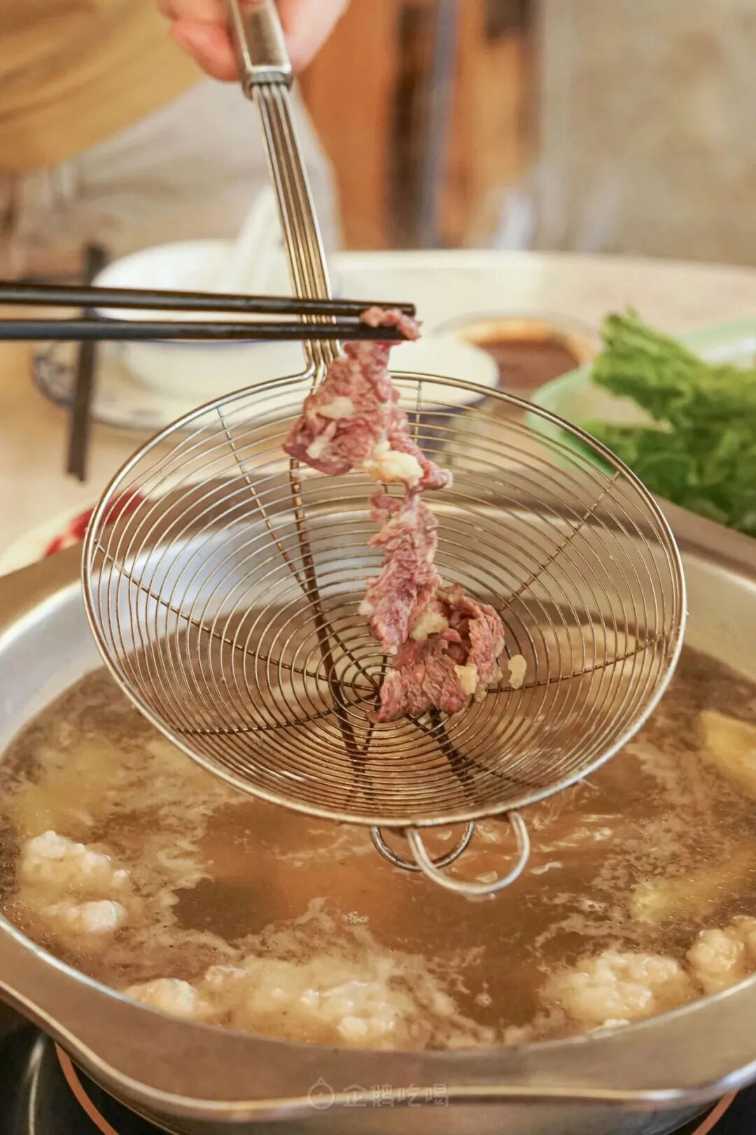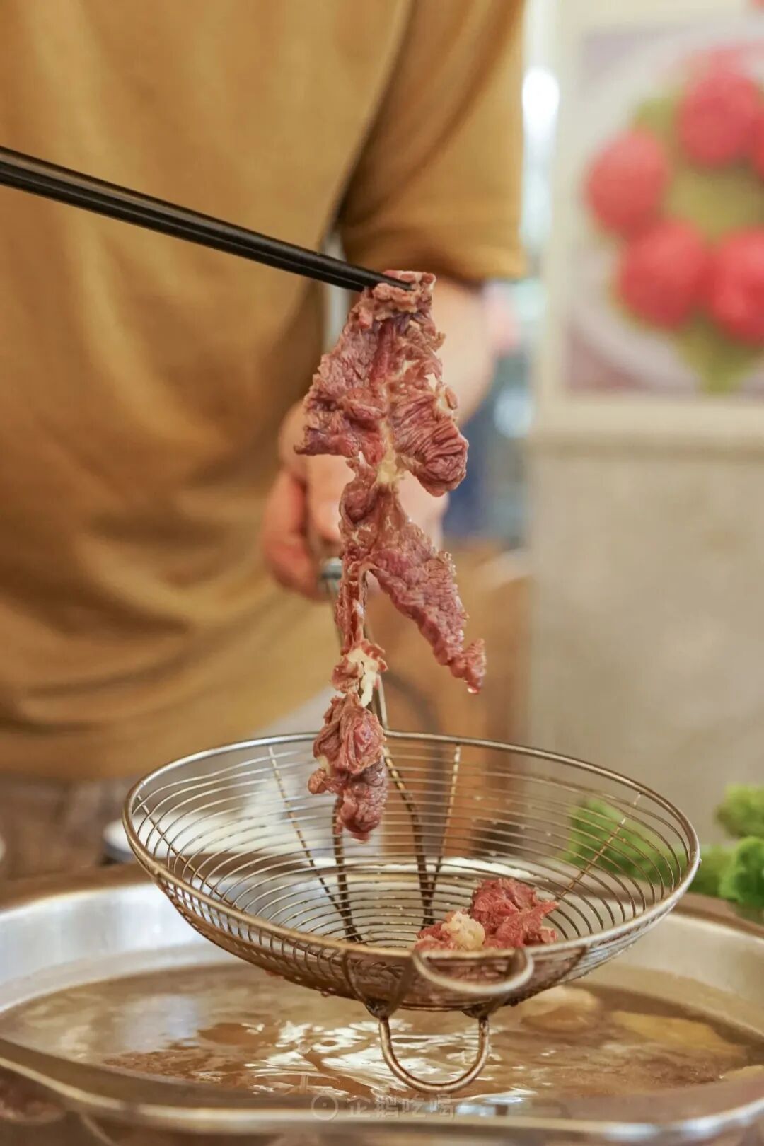 肉片分类投入,分段焯煮,笊篱在汤中一起一落,每一部位各有精确用时,作为牛肉火锅的老板,自然更懂得通过专业技巧把牛肉的优点放至最大。