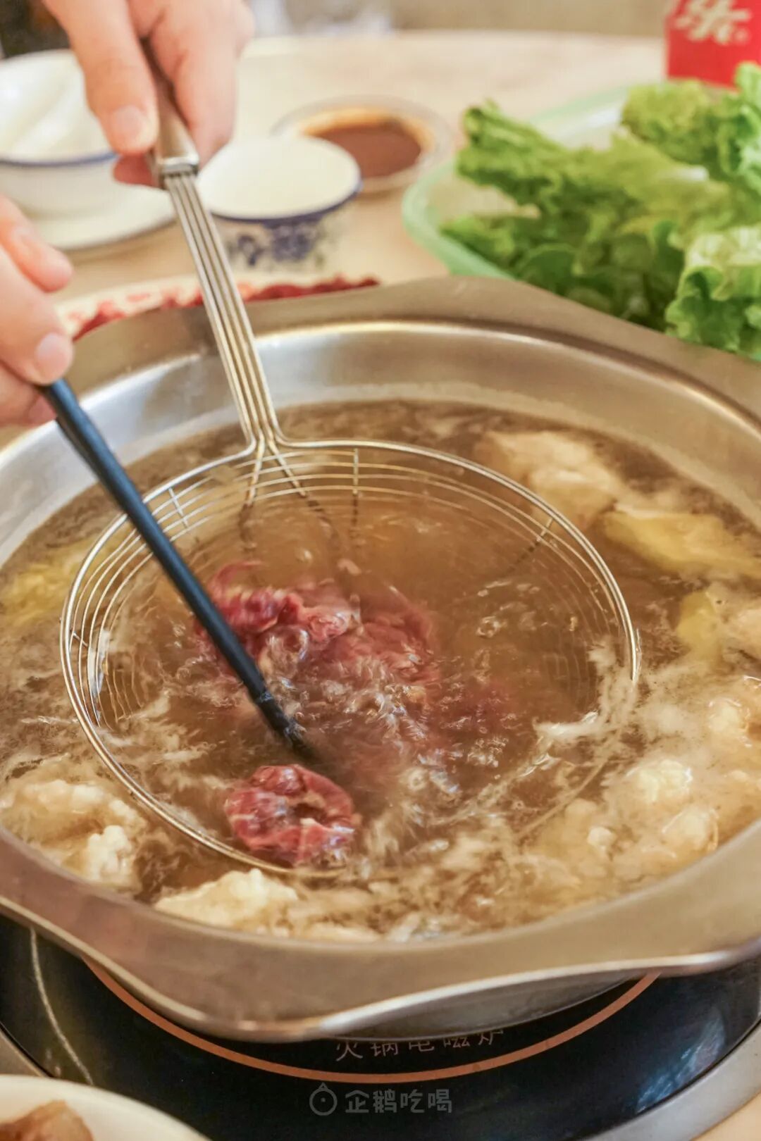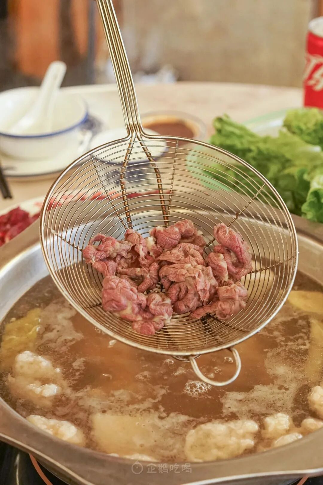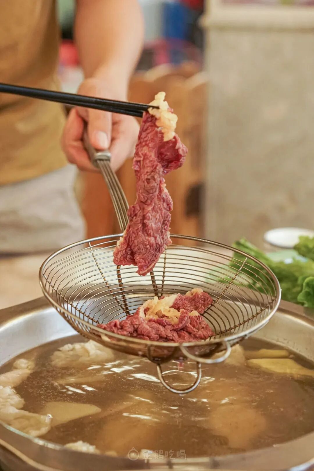 肉片分类投入,分段焯煮,笊篱在汤中一起一落,每一部位各有精确用时,作为牛肉火锅的老板,自然更懂得通过专业技巧把牛肉的优点放至最大。