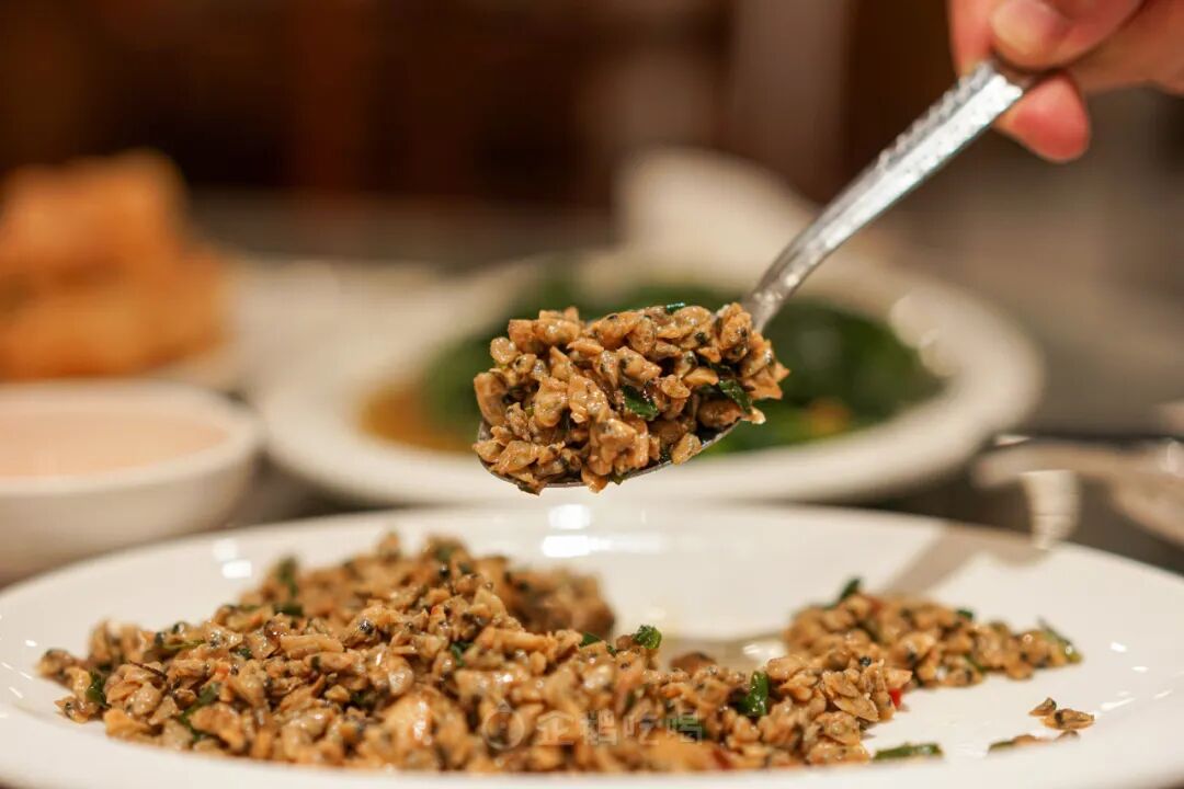 红肉米(蚬仔肉)也是必点杂咸,只有豆粒般大小,加入葱花、蒜头、红椒、韭菜等炒香,就被咸香吊出海产独有的鲜甜,很是惹味。