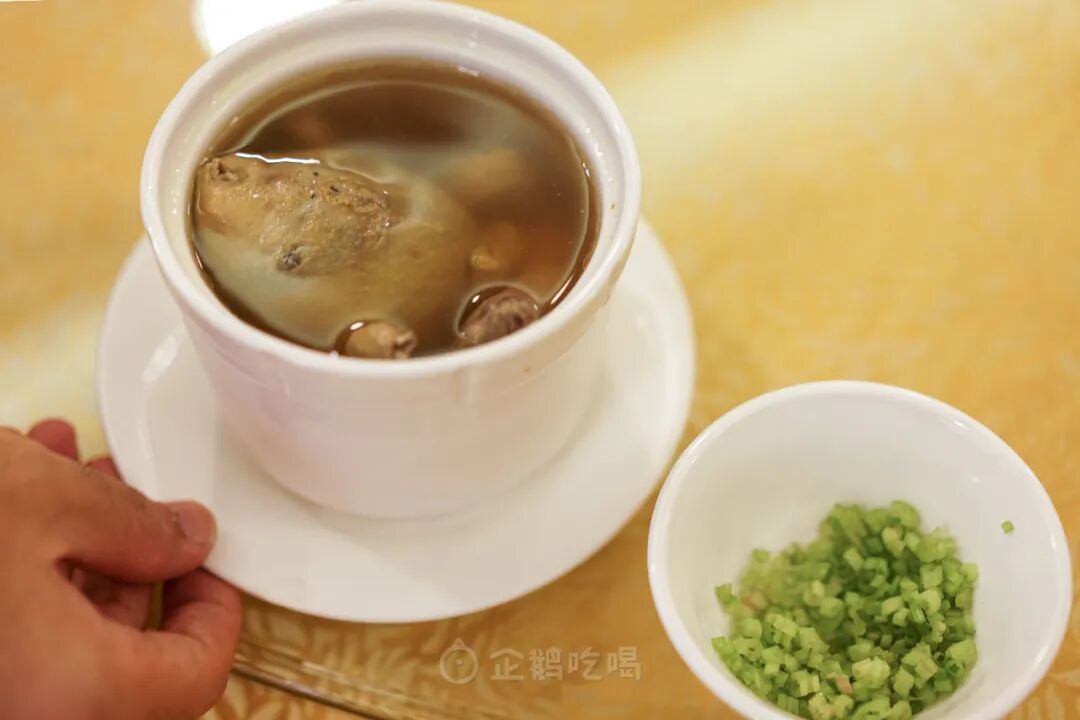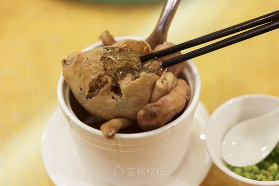 再填入事先焖煮好的鱼翅,填得涨鼓鼓后封口,加入鸡汤中熬煮。一盅皮不穿肉不破,将高汤香气煨入其中的鸽吞翅,每一步都是功架。