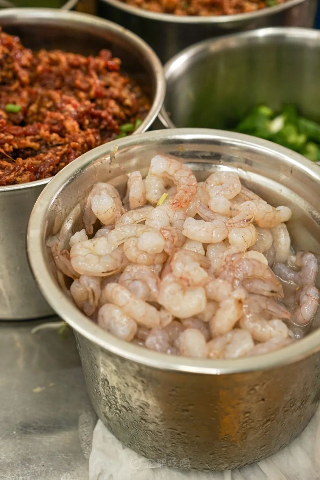 夜间派肠粉可以吃大树,虾仁刚刚焯好,从这剔透感就能看出食材新鲜。