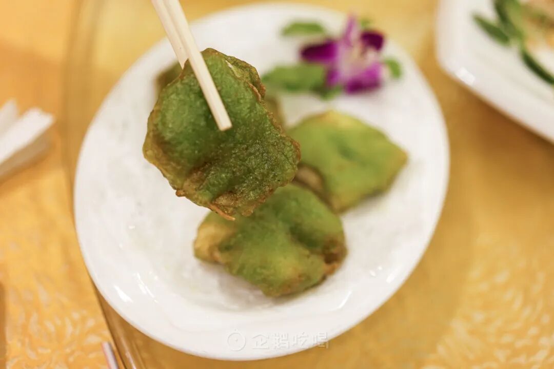 还有这道菜汁豆腐鱼,用潮汕常见的蕃薯叶打成汁,做成炸浆,包裹着软嫩的九肚鱼炸制,吃起来是天妇罗一般的精巧口感。