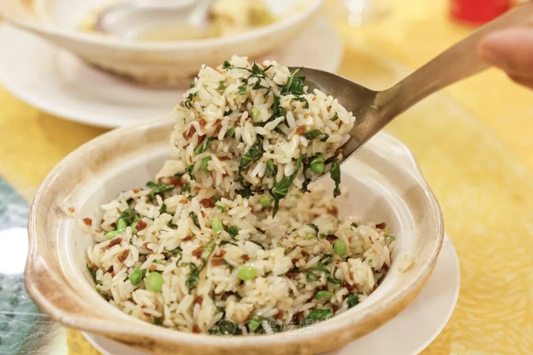 临时起意想吃炒饭,大厨就用了菜脯和芥菜粒来炒,上桌前还在砂锅里烧出一点饭焦,香气利落逼人,好吃!