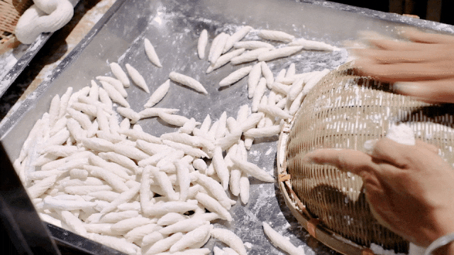 可以说是茂名当地的“芋圆”,以木薯粉(或番薯粉)为主要原料,一点一点揉搓成光滑不粘的面团后再做成各类形状。