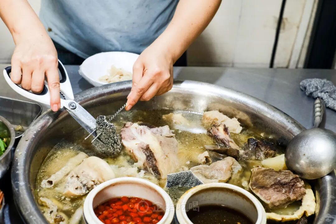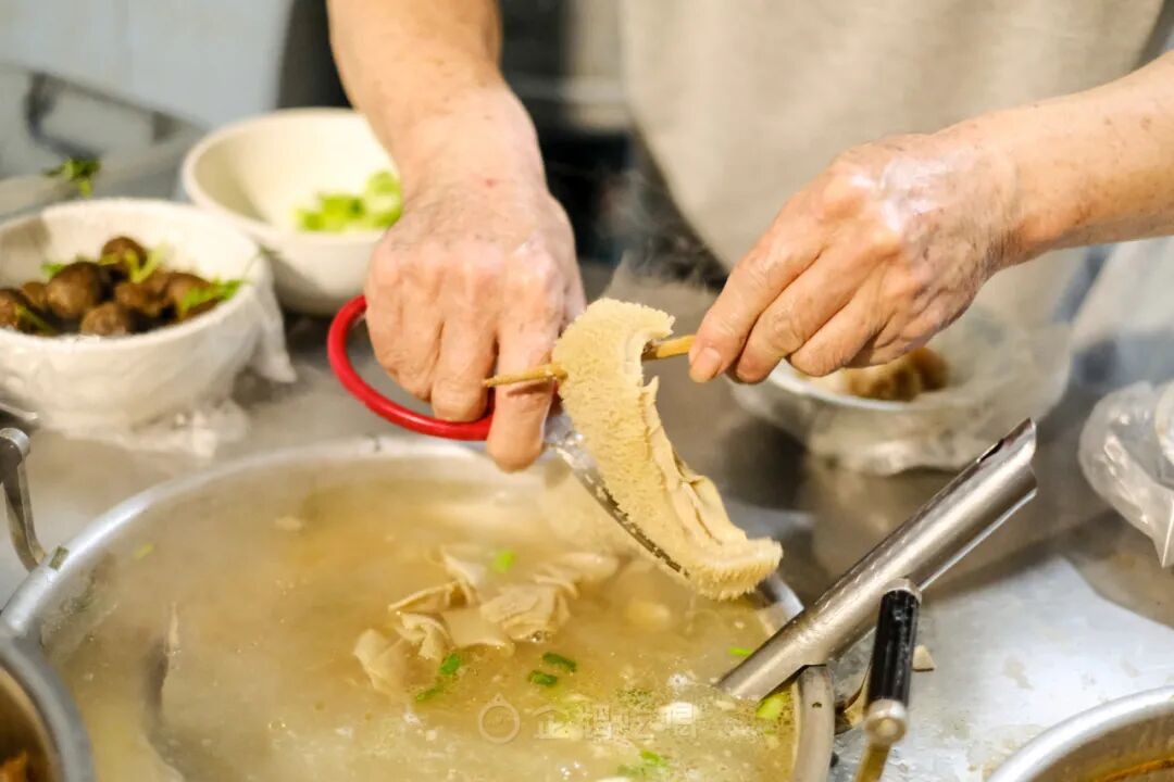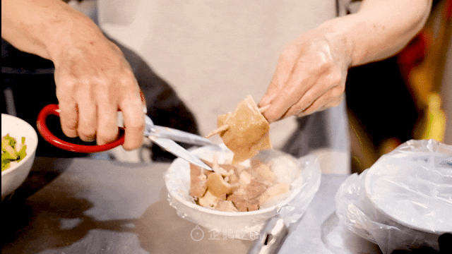 一锅能多达20+种部位,想吃哪个就指哪个,老板一手拿根小叉子串起大块的牛杂,一手拿着小剪刀,唰唰剪成小块到碗里。