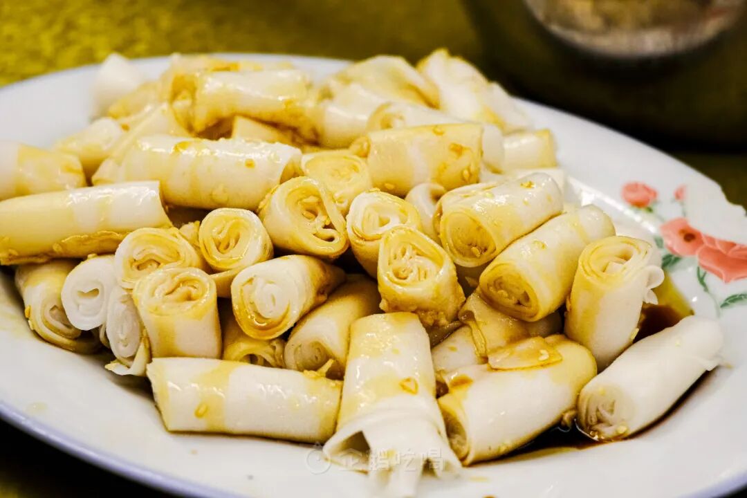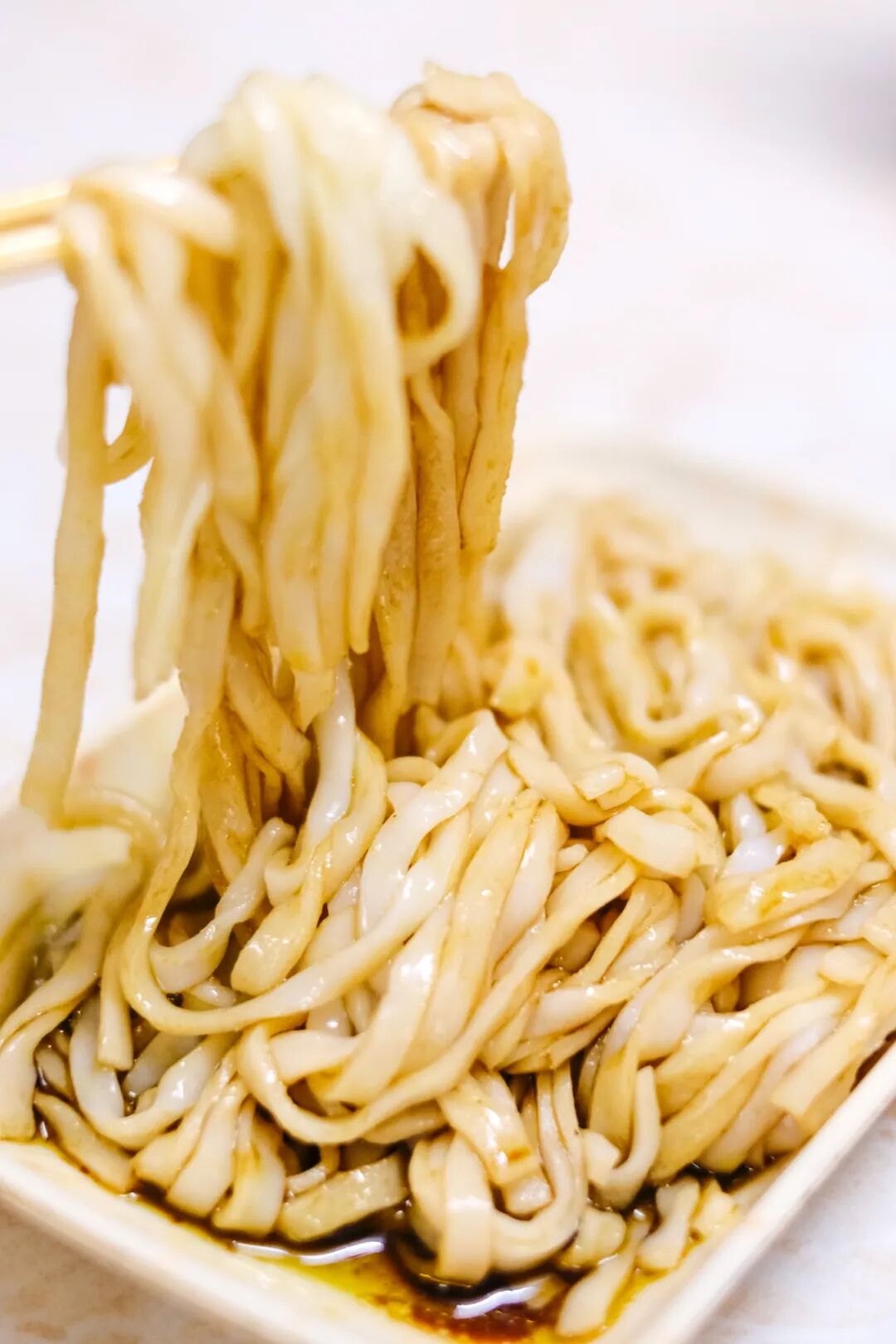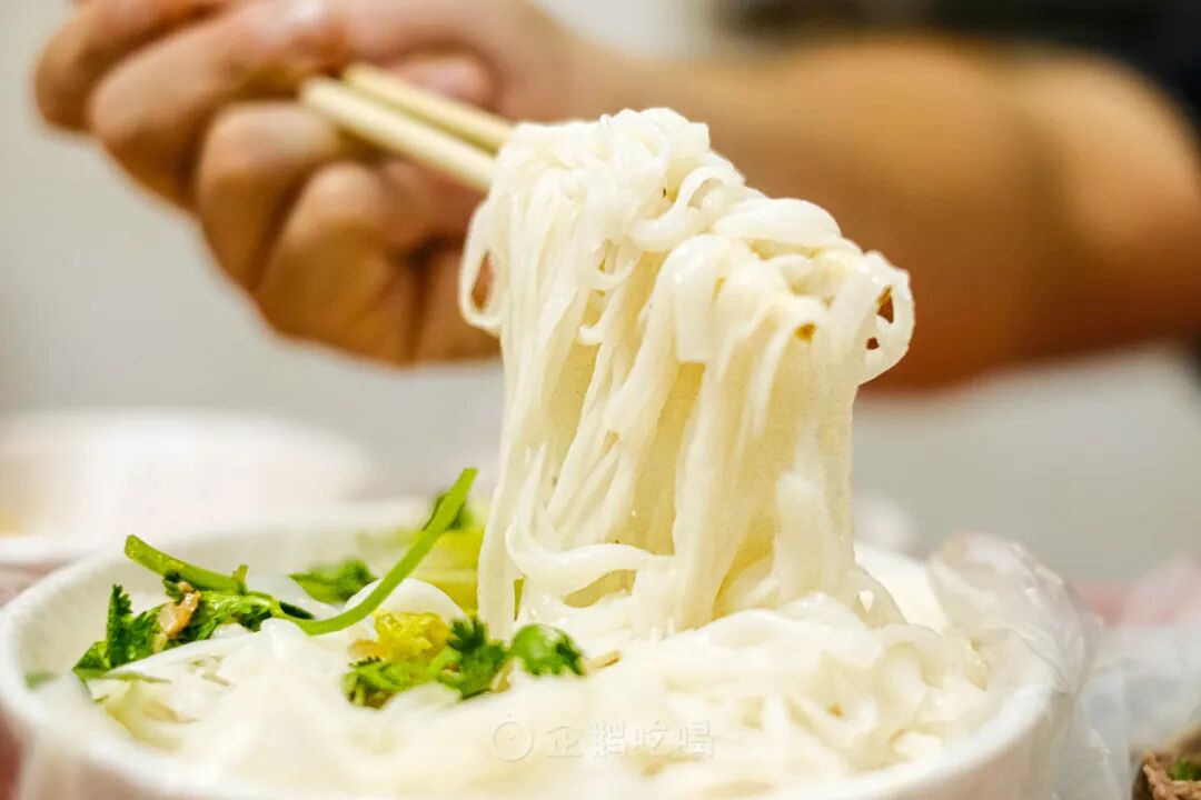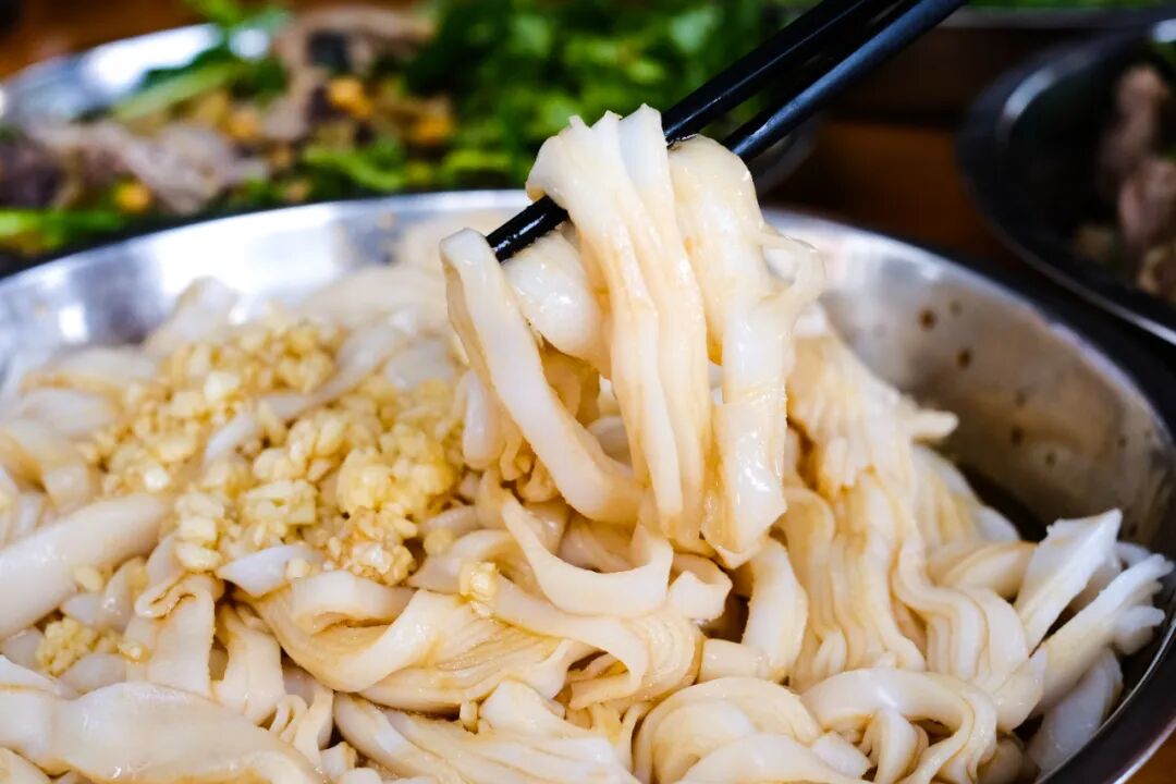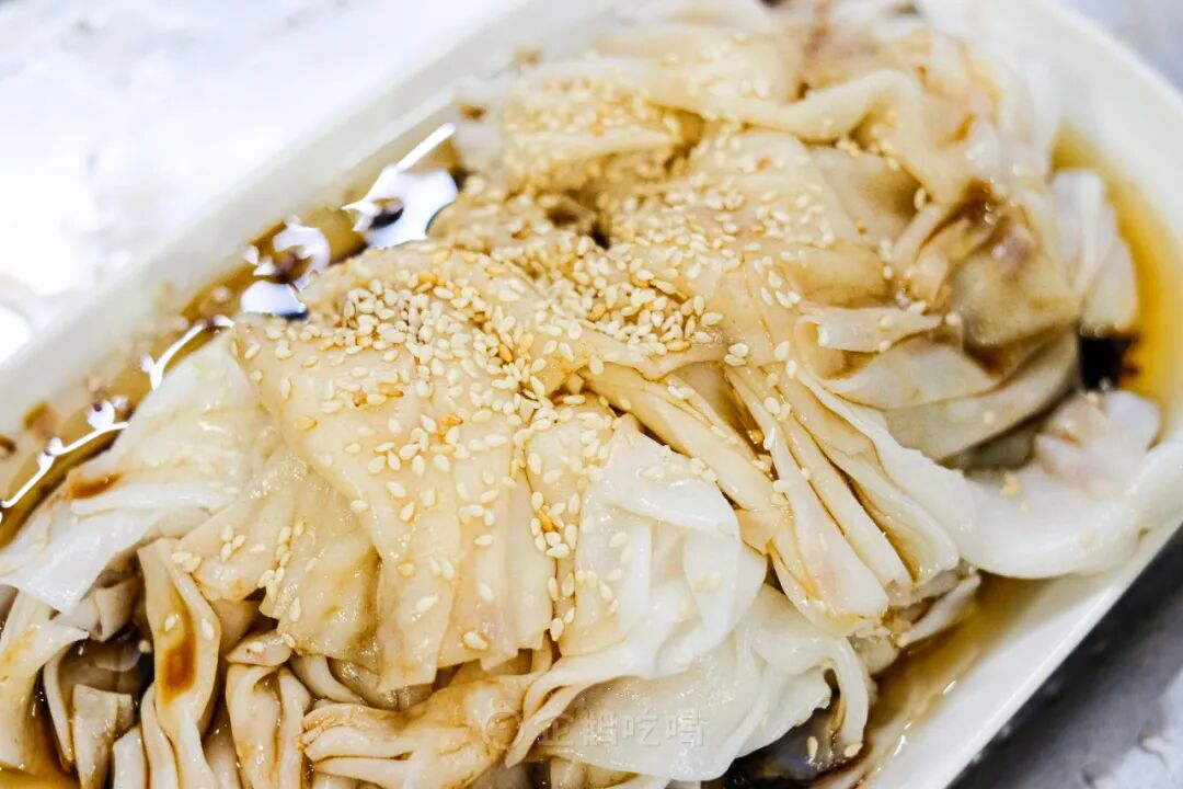 捞卷粉,一样是以香油三部曲加冕,粉如同混酱肠粉一样层层卷起,肉眼可见的薄!口感也要来得更细滑,米香最足。