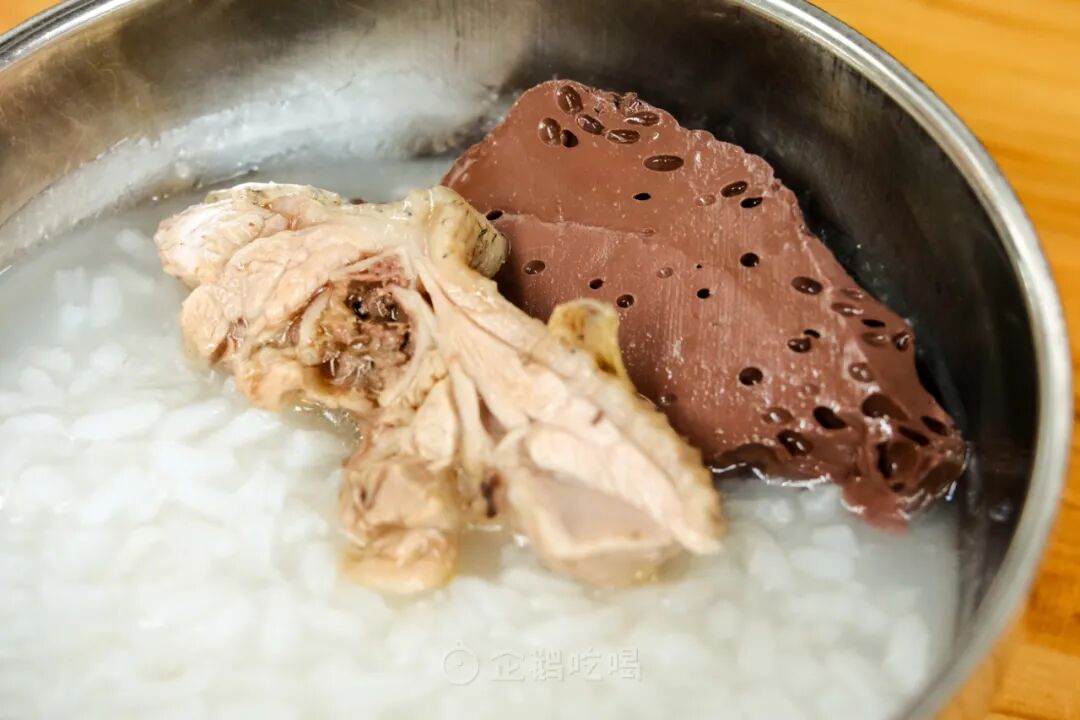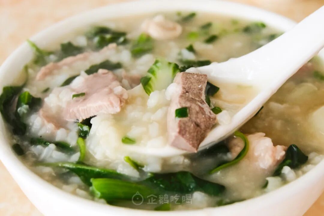 配鸭的粥,一派是拿煮鸭的高汤与部分鸭杂来煮粳米粥,电白水东镇多为这样出品。