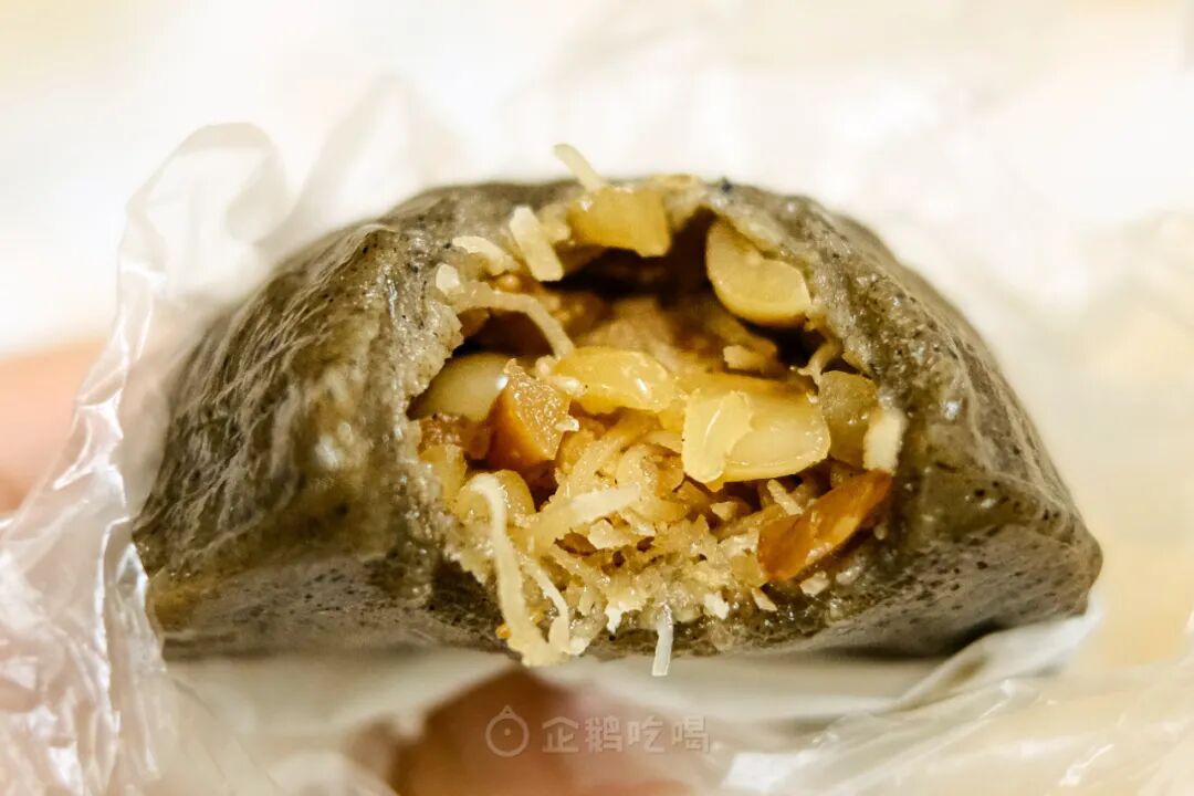 以艾草汁揉入粘米粉,染成墨绿色的是艾籺,包裹着花生、椰蓉、木瓜丝的甜馅。