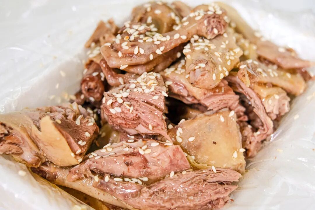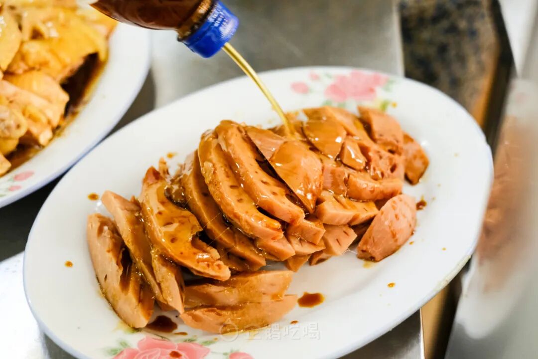 选的是嫩鸡,但腌得入味,记得让店家别切,手撕才是对这只鸡最大的尊重!于是在场的食客,便会上演一边叫着好烫好烫,一边争先恐后地撕着鸡肉的场景。