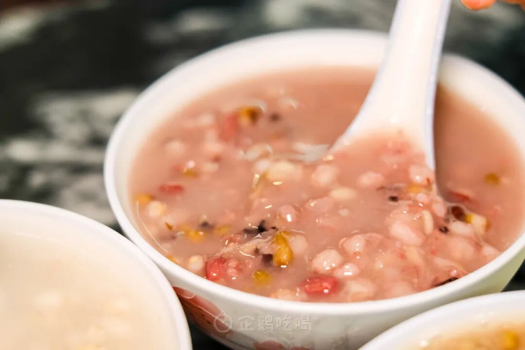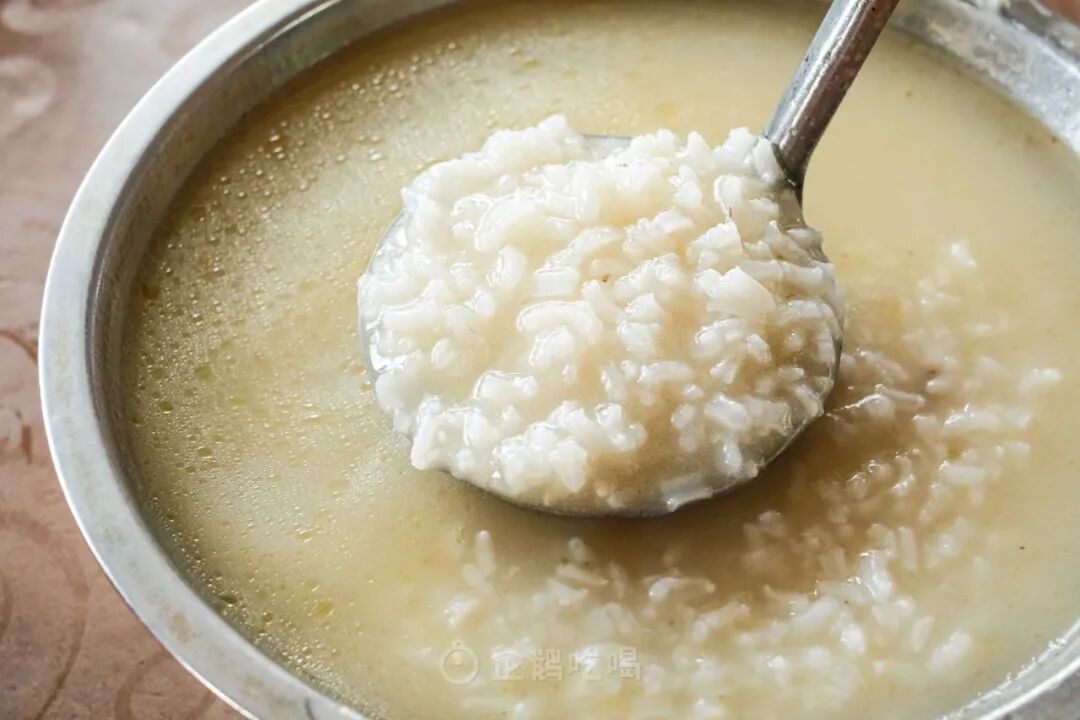米粒清晰可见,每一粒都煮开了花,质地细软,米汤稀薄更接近于肉汤,就算是大热天,也能酣畅地喝下。