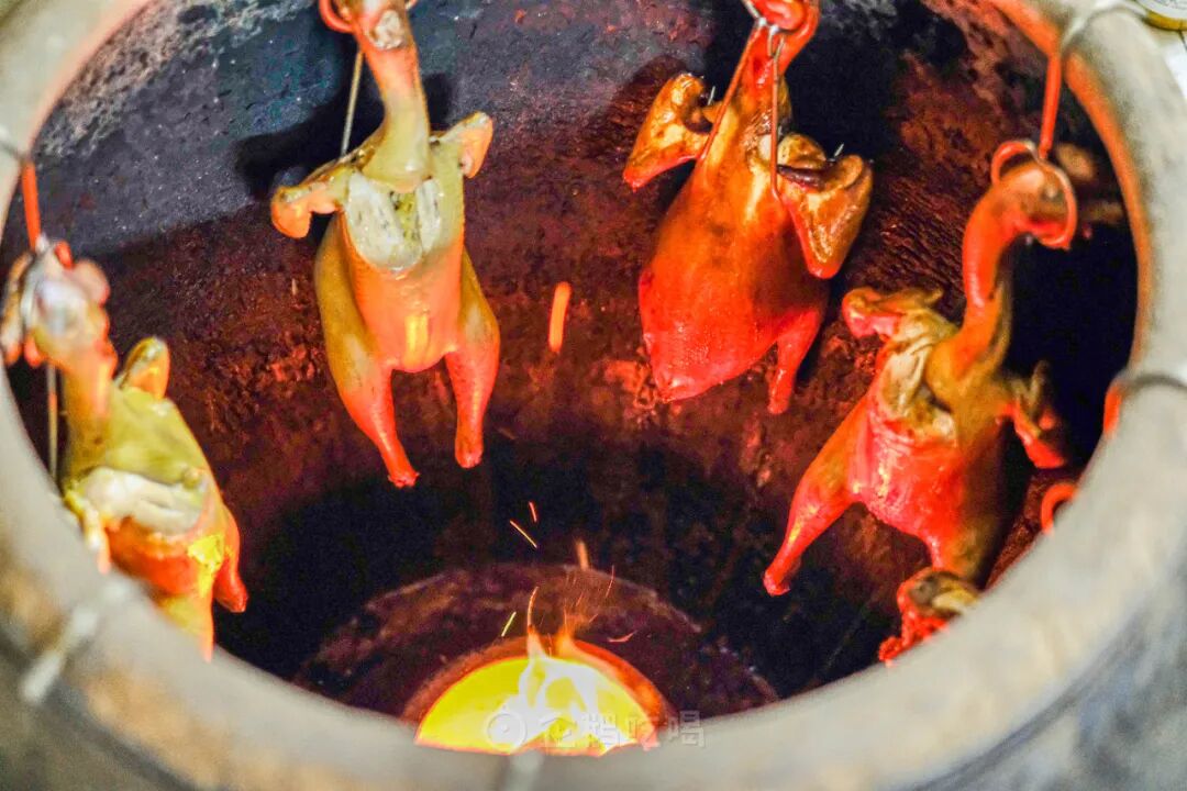 腌渍入味后,刷上脆皮水,送进硕大的瓦缸炉。