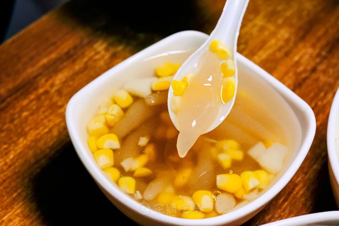 这样一碗冰镇玉米籺仔糖水,盛惠6元。玉米粒脆爽清甜,能吃出新鲜玉米特有的鲜爽苞谷香(就是玉米棒玉米芯的味道,不是成品冷冻玉米粒),Q韧的籺仔在勺上滑转。