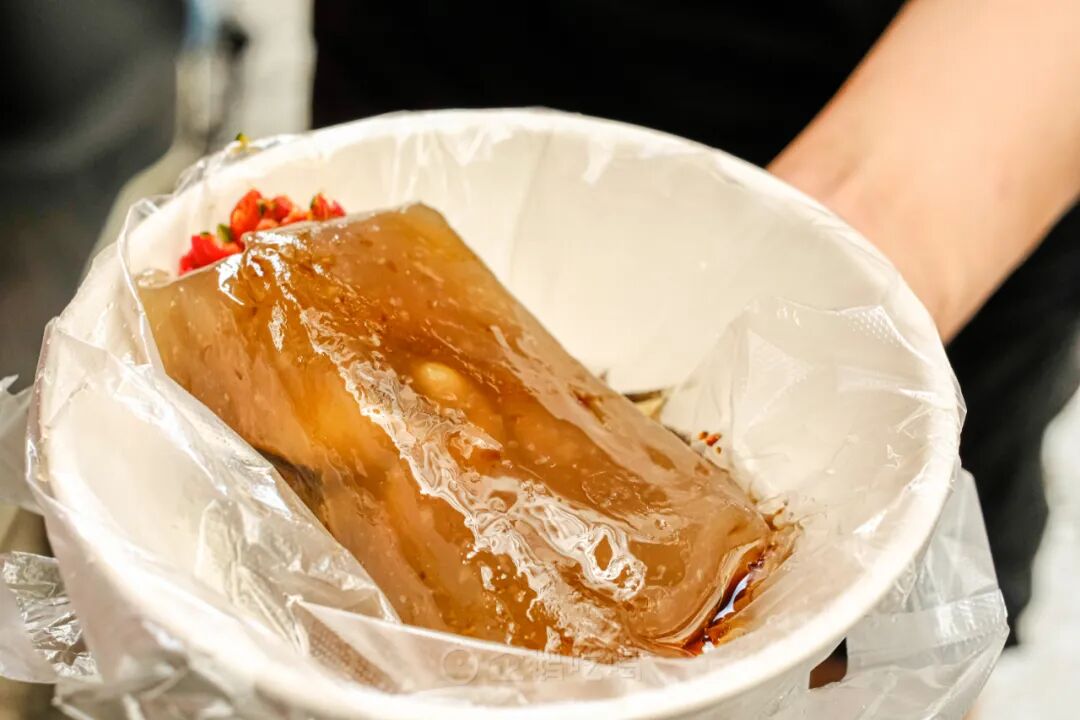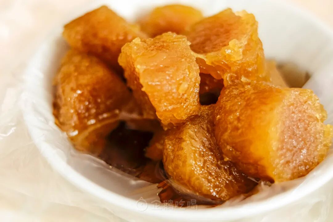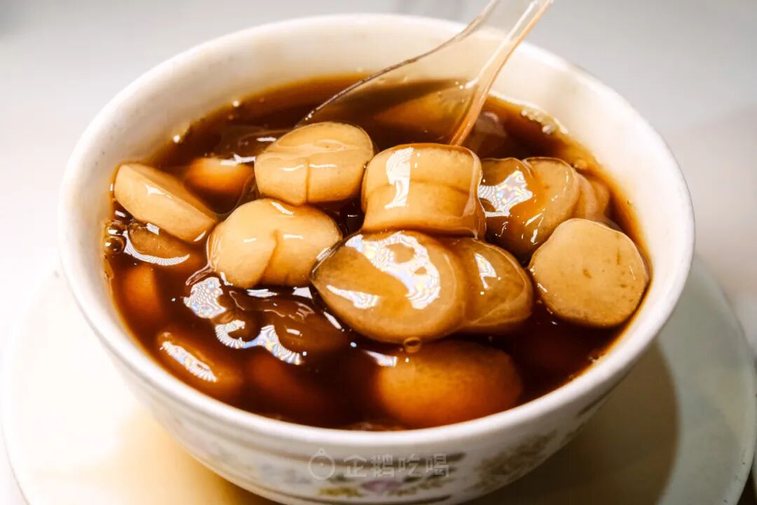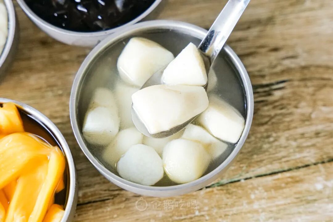 煮透后呈半透明,挂着剔透的冰糖水,出落得有白玉般莹润的光泽感;口感与阿达子很像,Q弹滑爽,比芋圆更多几分的韧劲。