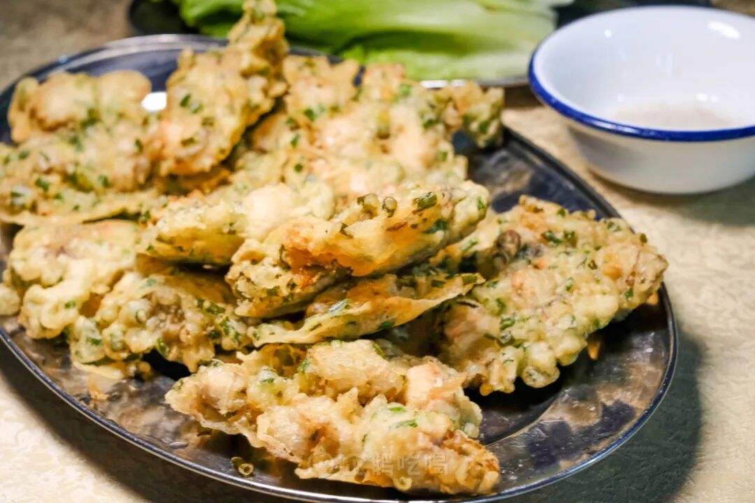 电白蚝炸,会在裹粉面衣里混入一定粘米粉,几颗蚝仔拖着香葱面糊进锅油炸。