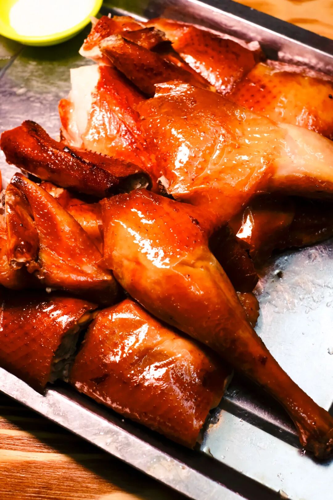 约20分钟后,我们的脆皮烧鸡终于粉墨登场,鸡皮已烧至动人的琥珀色,几近半透明状,微微透出底下的肉色。