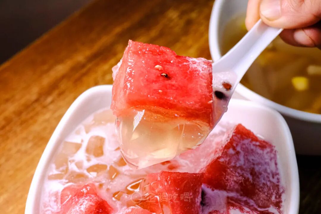 比如一份西瓜冰,你可以要雪梨冻做底,再加一勺西米露,盖上大块的冰西瓜后,再淋上一层甜香的椰奶。