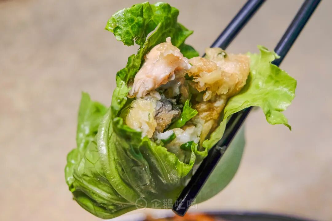 炸衣甚至比蚝仔更喷香好吃,口感如天妇罗般酥香轻盈,包生菜蘸椒盐吃,是不错的下酒小菜。