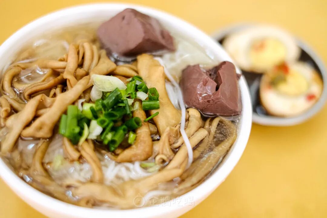 8块一碗的鸭肠粉,也有意思。少见到单以鸭肠为主打SKU的碳水:顶上盖满了脆弹入味的鸭肠与两块鸭血,再配一颗连蛋黄都卤进了味的辣卤蛋。