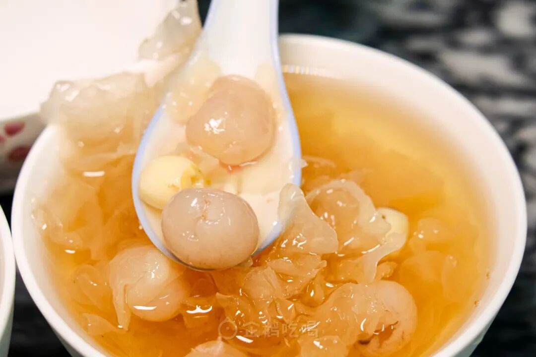 雪耳元肉莲子,用的是新鲜去核的龙眼肉脆嫩,雪耳汤都沁着龙眼香甜。莲子也特地去了芯,整个人吃完,从头到脚都澄净了。