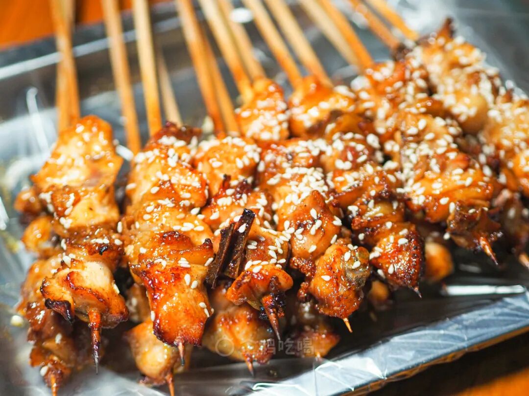 下陂烧鸡王的酱汁调味鲜辣酱香,又带着点甜咪咪感,还要再撒一层喷香的芝麻,很是下酒,多吃几串,不擅食辣的人会有些嘶哈嘶哈。