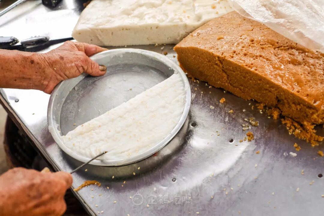 将自磨的米浆放在簸箕形的容器内,一层蒸透后再叠加,开始蒸下一层,如此叠加三层后,用刀划棋盘形,抹上橄榄菜,淋上香油后食用。