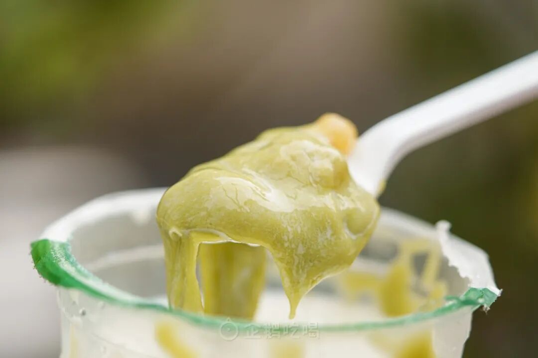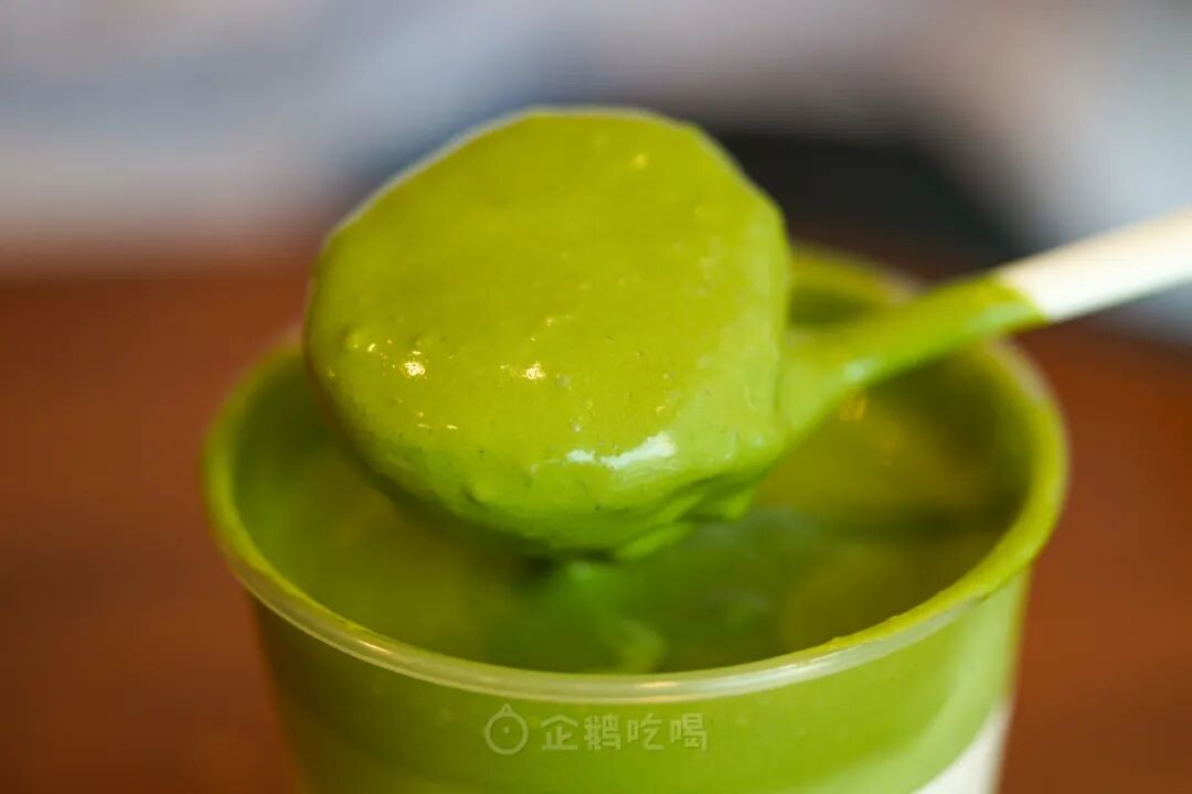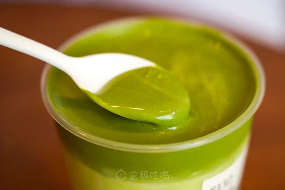 用勺子提起,绿麻薯像融化的棉花糖,在勺子两端泄下拉丝瀑布,给浓郁的鲜奶盖上一层轻盈的羽绒被。