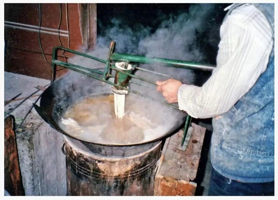 荞面有点像陕西的荞麦饸饹:荞麦粉+少量面粉制成面团,由特制的有细孔的木榨直接将面团榨压成细面条,注入木榨下的沸水锅中。