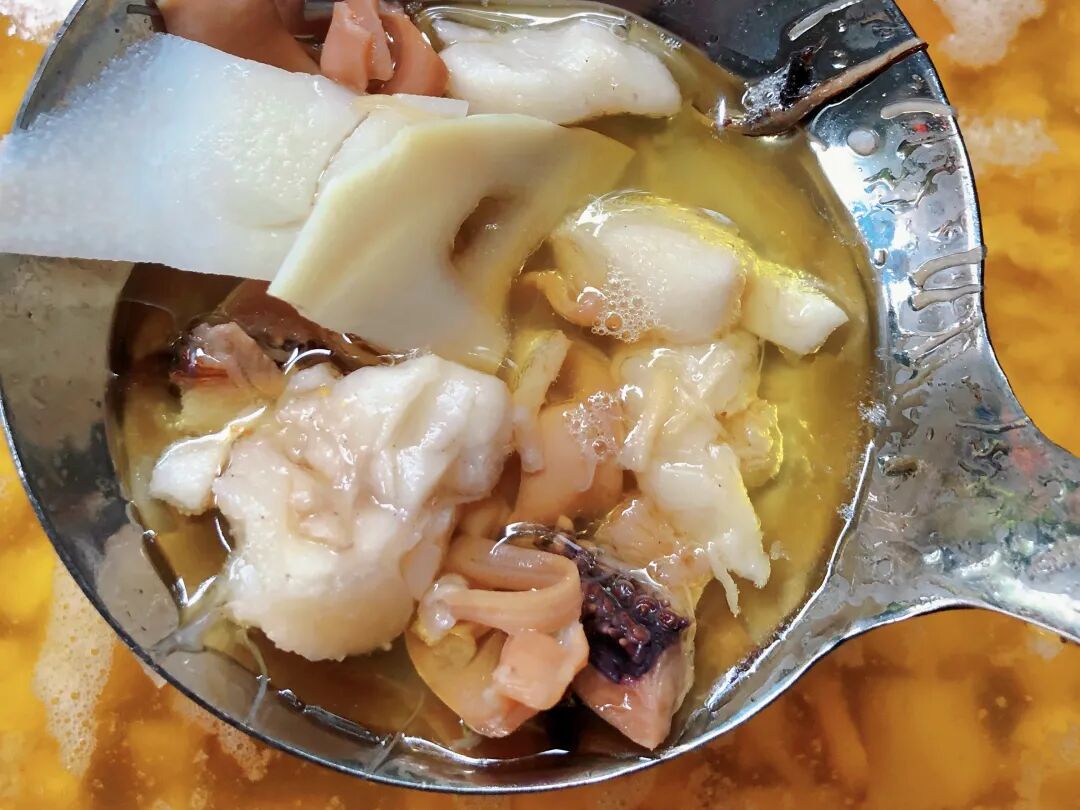 四川不靠海,因此会用各种海鲜干货去吊汤,不似新鲜海鲜煮出来的清鲜,而是更浓缩复杂有韵味的鲜就像鲜虾和虾干的区别,是川人对“海味”的独特想象与诠释。
