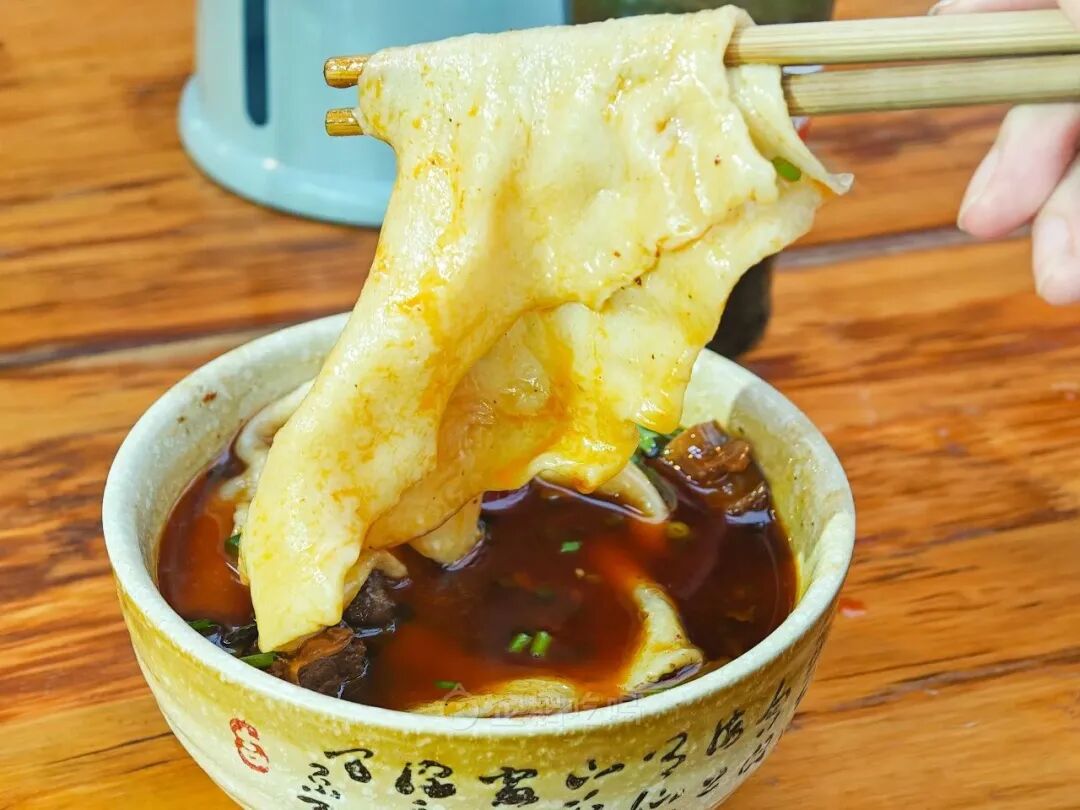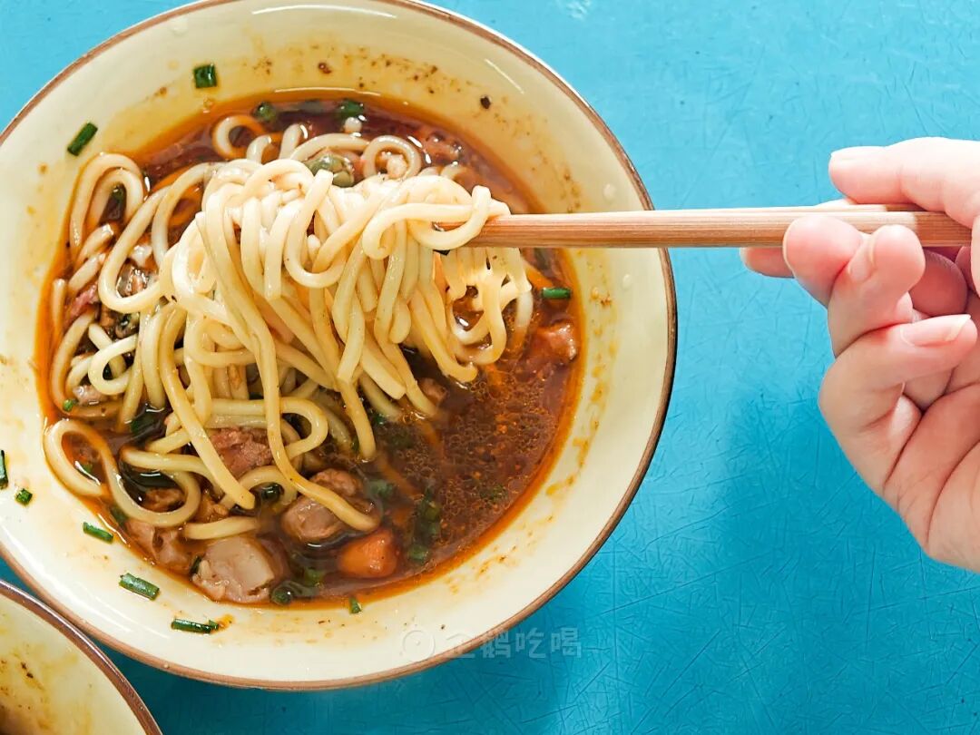 虽然不如西北拉面筋道,但确实比其他四川扁面多一点厚度,正是这一点厚度+反复摔打令面条更紧实不散不容易烂糊,让它有一种“弹牙”的咀嚼感。