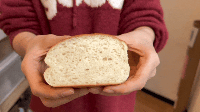 风味干净,以清新的面粉香为主,内里气孔均匀,湿度恰好,随着咀嚼,能吃出轻微的发酵酸度,简单又平衡。