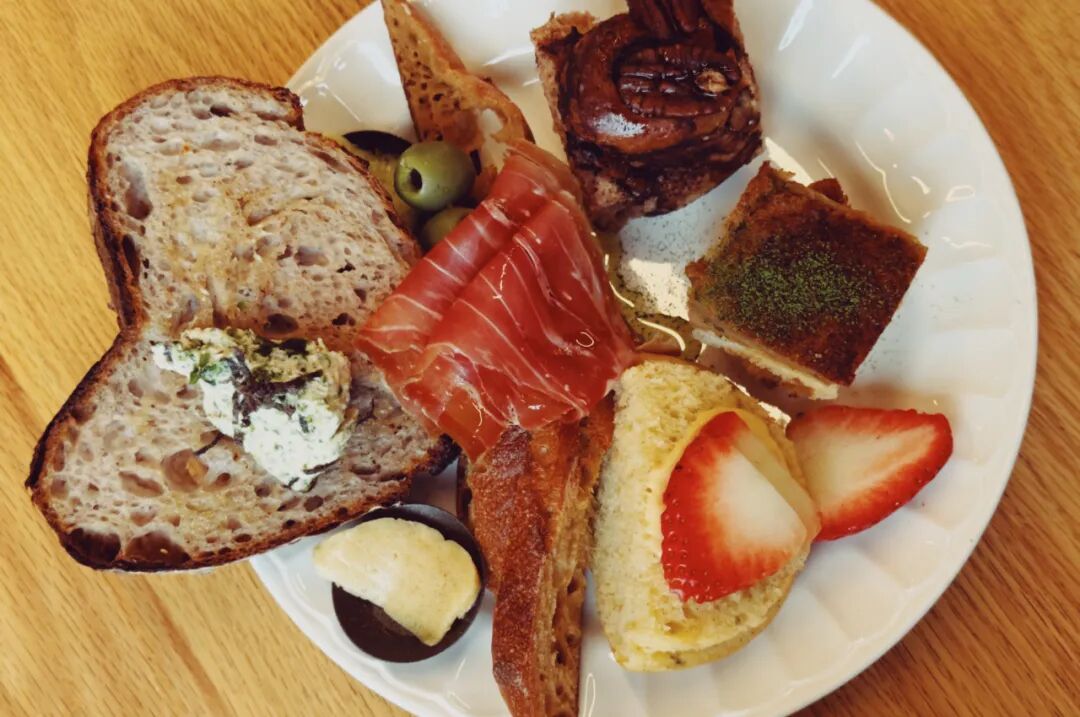 ①淡口的乡村配青海苔素奶酪;②酱油法棍配伊比利亚火腿、金奖橄榄油;③香草日本柚豆乳面包,有点像maritozzo(一种意大利奶油面包)与布里欧修的结合版,但要柔软轻盈得多,像蛋糕;④布丁口感的法式吐司;⑤碧根果肉桂卷最中间的芯。
