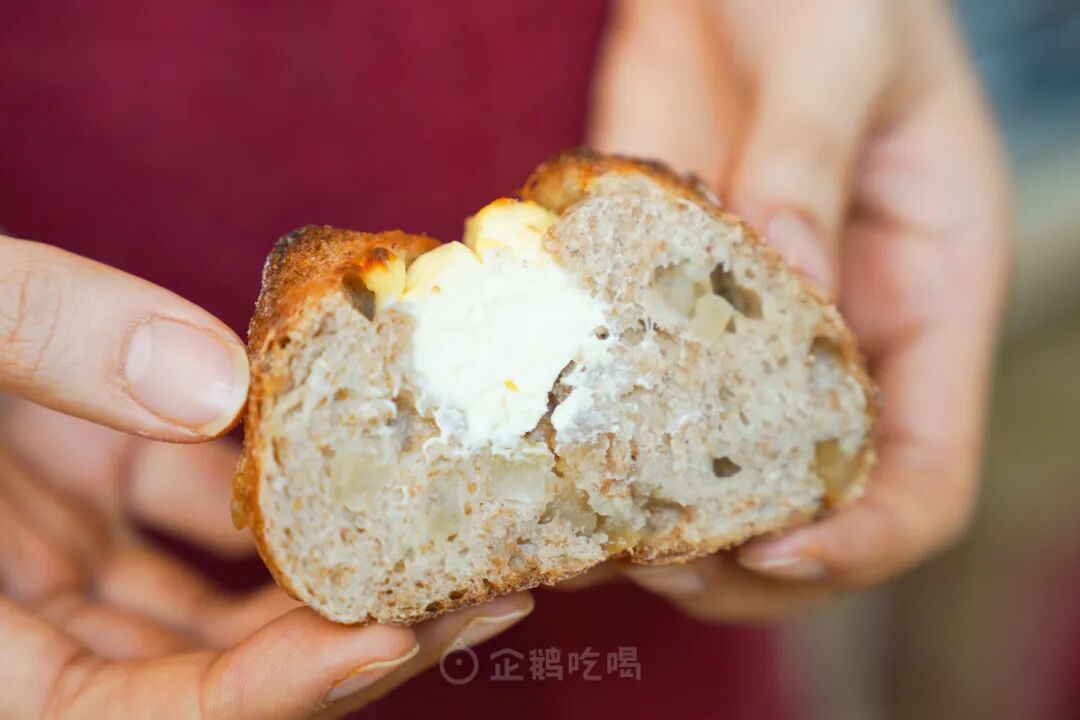 硬壳,奶茶味明显,贝果体韧性十足。夹心是青稞混合着奶茶乳酪,口感Q弹有劲。