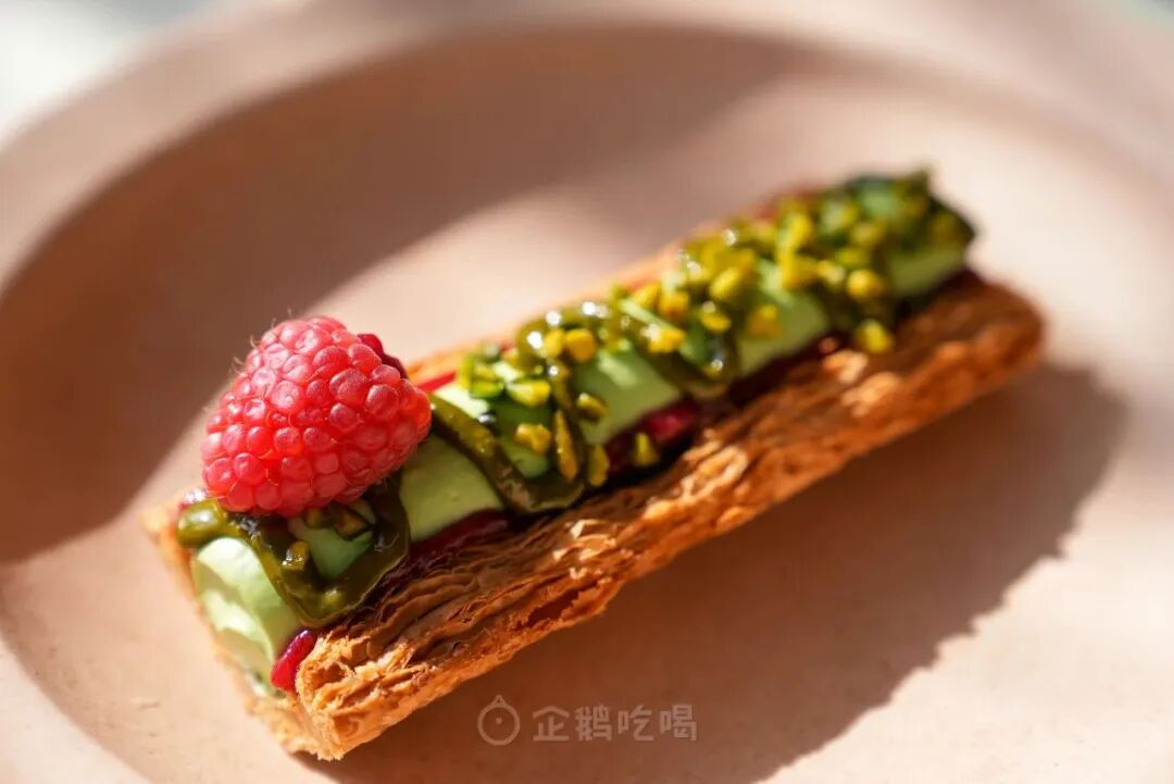 开心果酱呈黄绿色,比不少碧碧绿的开心果酱、开心果奶油要来得浓香得多;自熬的黑醋栗果酱酸甜清新,平衡了醇浓的坚果风味。