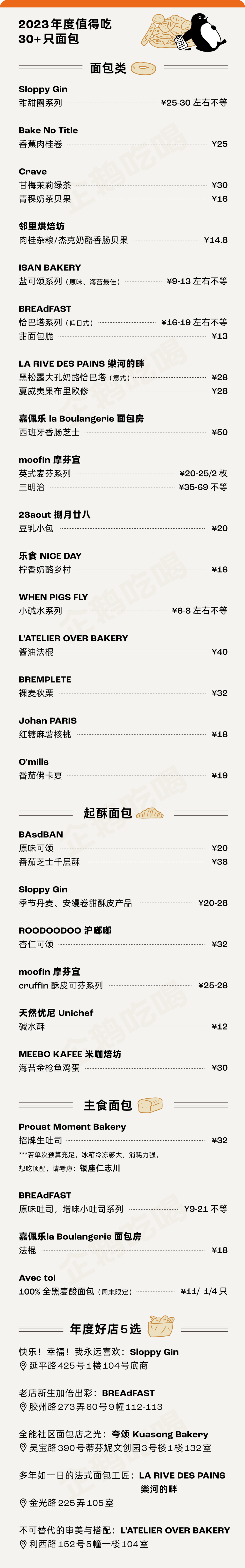 30只的名额很有限(有些按照大类推荐了,其实不止30只😄),我们更想推荐给大家的,是味道对得上其价值的面包。每只面包下肚后,多少能让人感觉到主厨独特的风格或个性。