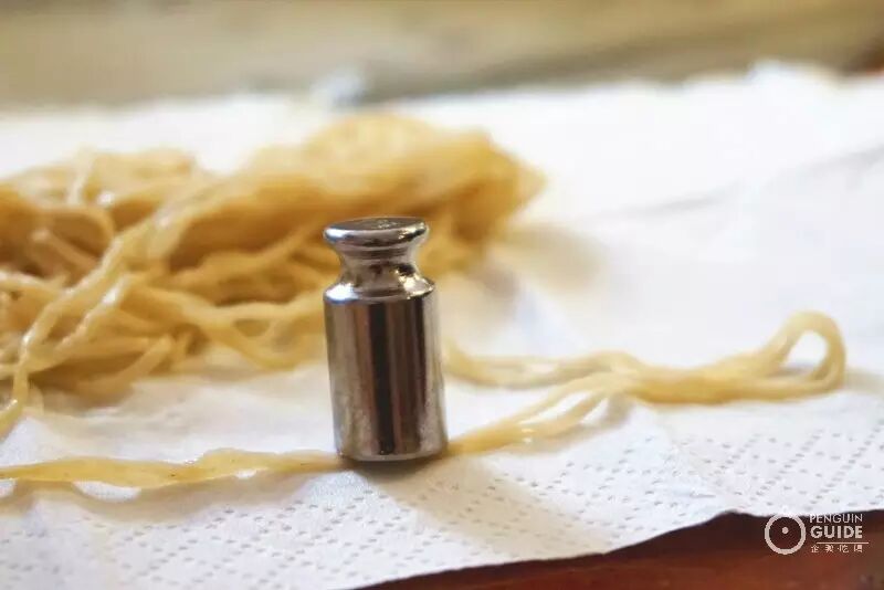 面条颜色较为灰黄,可能制作时缺少了鸭蛋的滋养。在 10g 砝码力压下,弹性相对比较良好。吸食时也能感受到面在口腔内抽拉的快感。