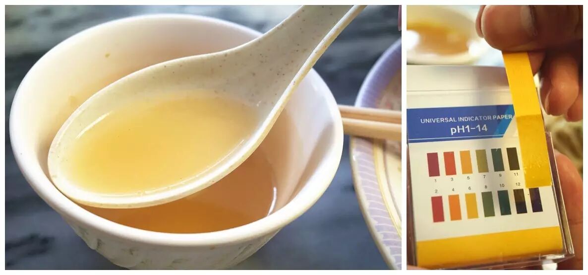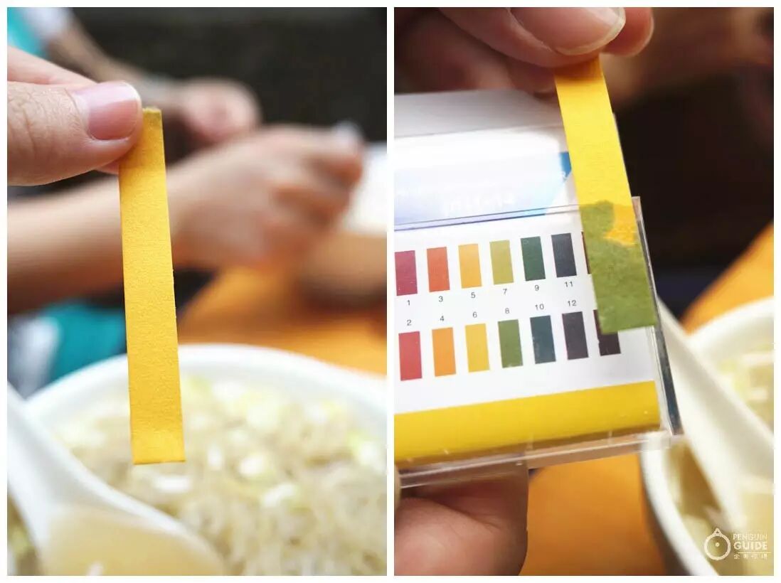 广州人吃云吞面,必先喝一口汤。汤底颜色偏黄厚,尝起来猪骨味比较浓厚,口感偏甜,盖过了些许鲜味风头。放入PH试纸测试显示,酸碱度较为平衡,如果不太能接受碱水面过重的风格,这会是一个好选择。