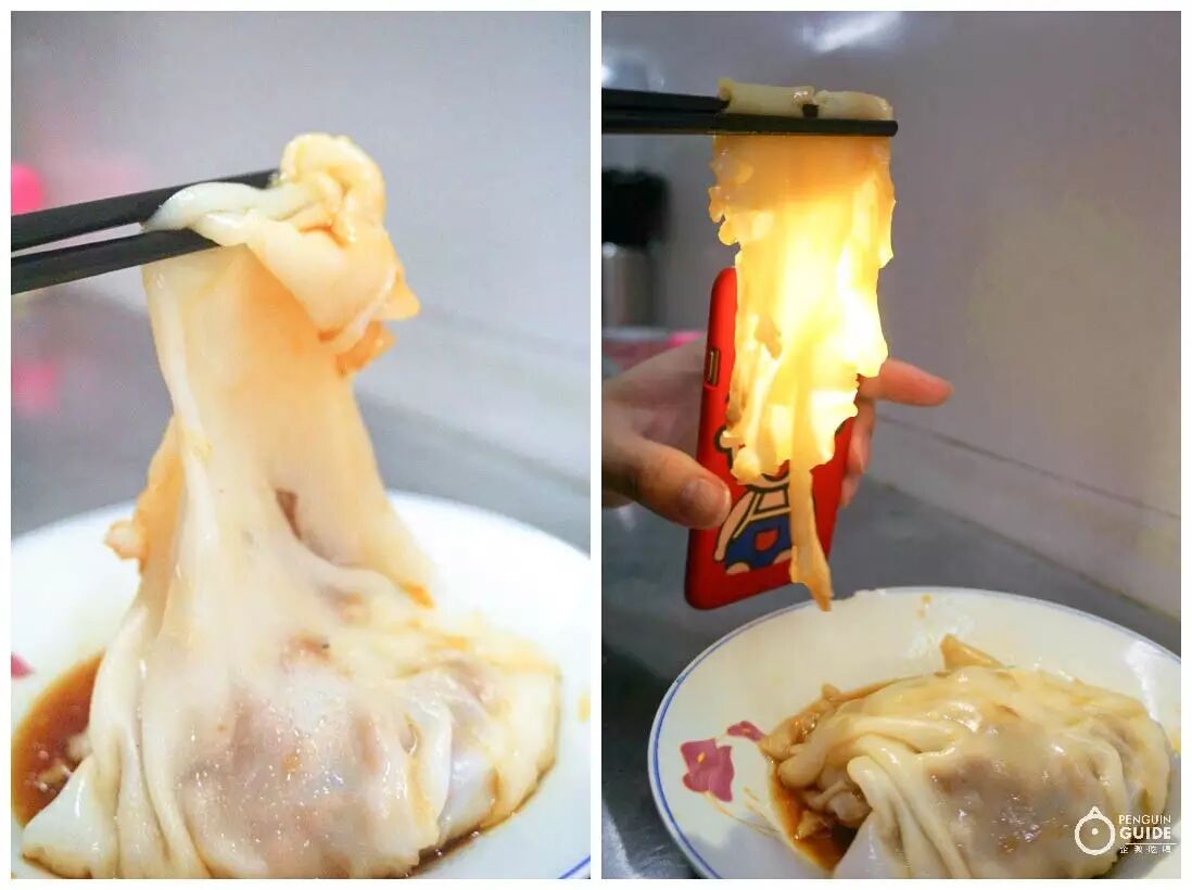 新联肠粉卖相家常,大圆盘映衬着涨鼓鼓的肠粉脸。细细用筷子挑开肠粉皮,发现这“脸皮”还有点厚。用手机打灯一照透光度,略厚的粉皮为我们”完美“阻挡了大部分光源。