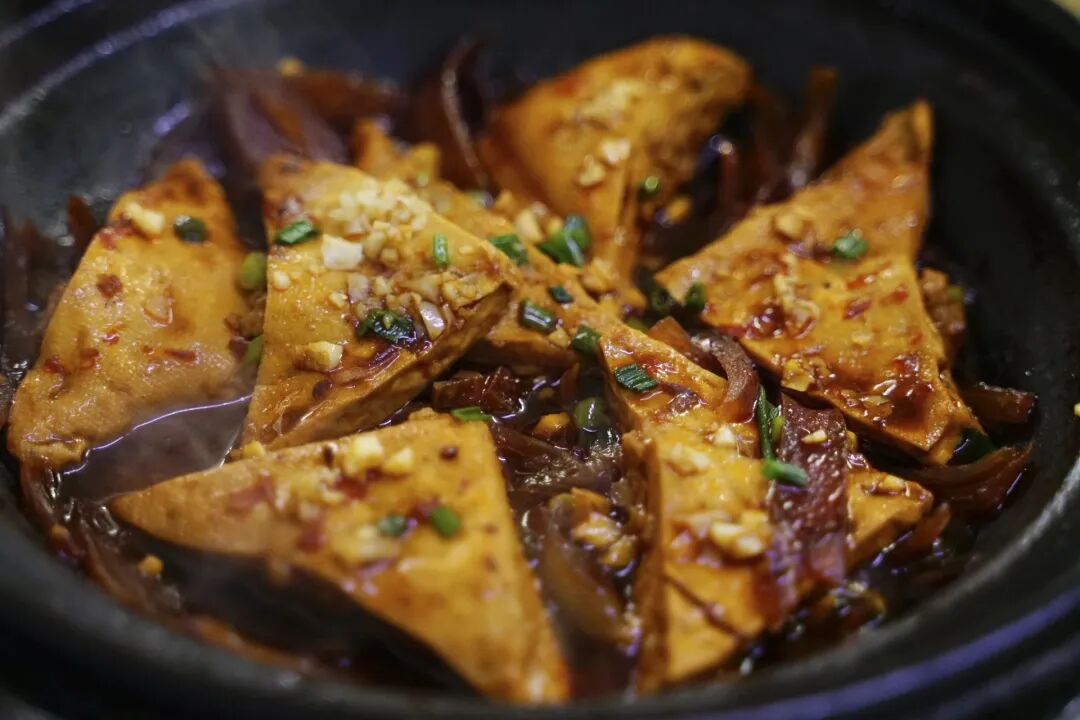 臭干煲,不是发酵的豆腐而是豆干,中间酿着肉末。用豆瓣酱打底味,砂锅底铺满洋葱增香,豆干发酵后更加松软吸汁,“够味!”。