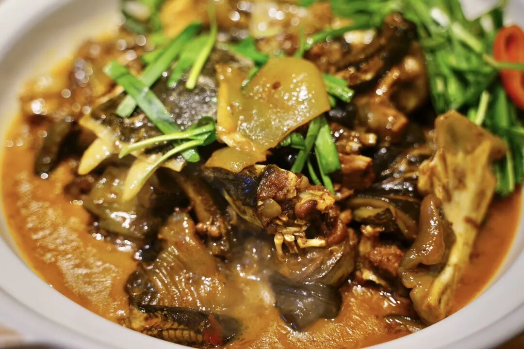 比如常见的红烧甲鱼,这家会是甲鱼+鳝鱼一起红烧。甲鱼肥糯,鳝鱼弹嫩,让两种不同维度的水鲜相互交融,比单纯的红烧甲鱼更有鲜美层次。