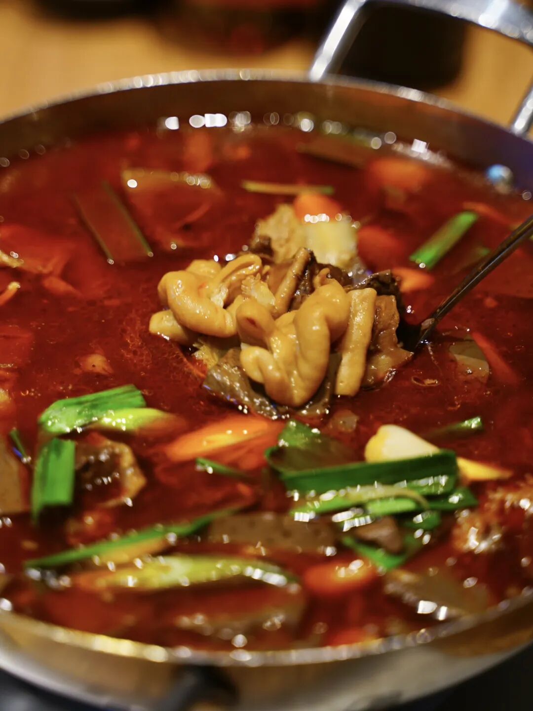 比如牛杂大肠锅:内脏爱好者一定会爱,毫无腥臭。和台湾菜的五更肠旺常用卤汁做汤底不同,这里是类似重庆牛油锅底般的醇香麻辣。大肠内壁的油脂剔除得干净,口感洁净清爽不肥腻;炖得软糯的牛肚牛筋之外还有嫩滑的鸭血,几种口感交织在一起,一口下去非常上头。