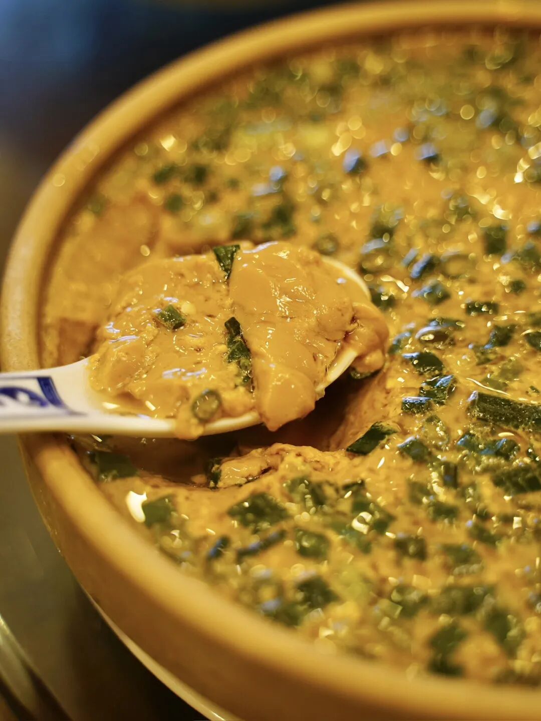 比如一份简简单单的蒸农家土鸡蛋,很久没吃到这么香的蒸蛋:其实不过是土鸡蛋够香,以及灵魂调味:一勺酱油、一勺猪油和超多小葱!