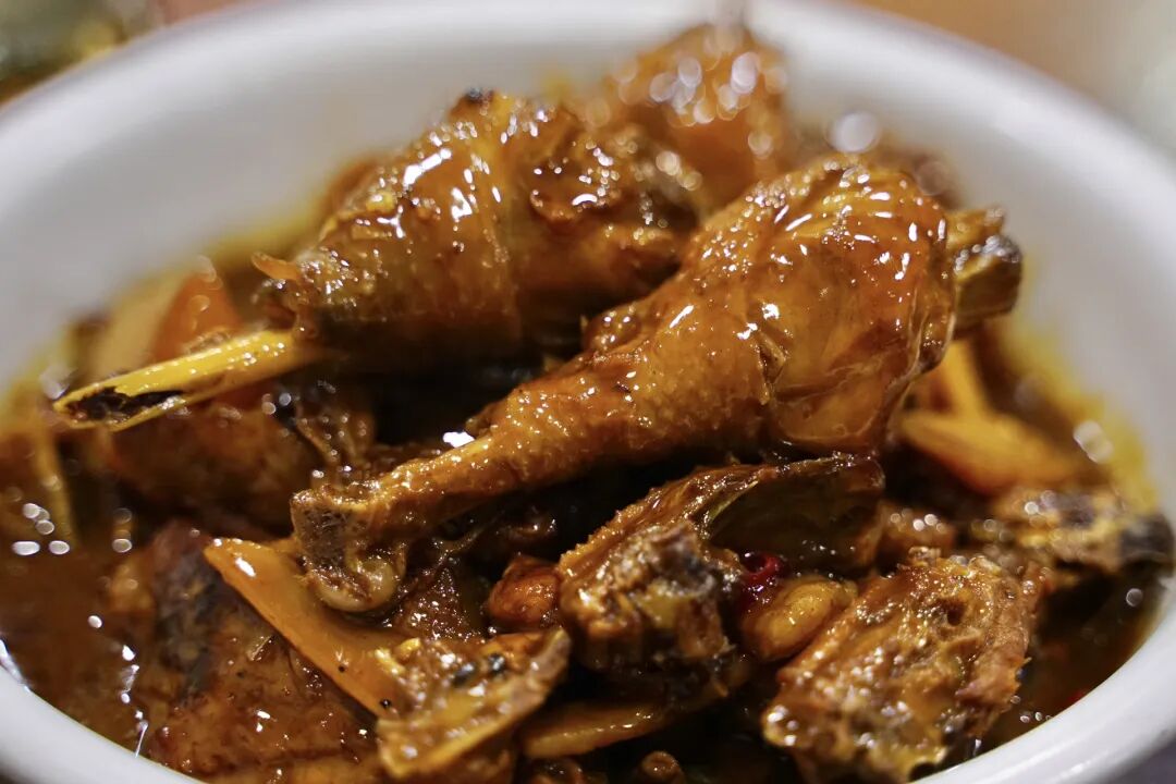 比如这个红烧公鸡:这家特地用了三年以上的老公鸡
