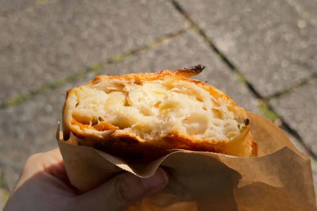 当季的野菜面包,将蔬菜切碎混在包体里,其貌不扬,咀嚼间能感受到蔬菜的清香和甘甜感,与面粉的清香融为一体,舒服好吃。