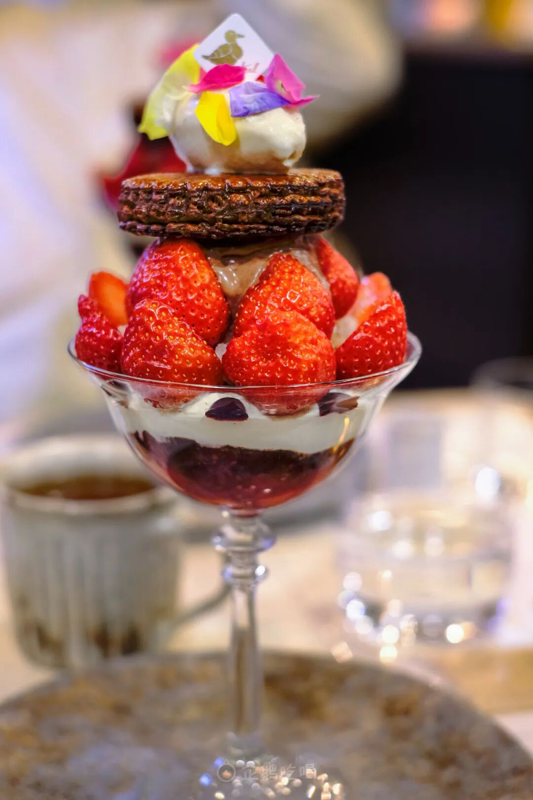 今年的草莓芭菲是古典洛可可风,马卡龙中间点缀的甘纳许奶油与珍珠糖,像欧洲宫廷淑女盘发上的珠宝,惹人怜爱,精巧到不敢出声。
